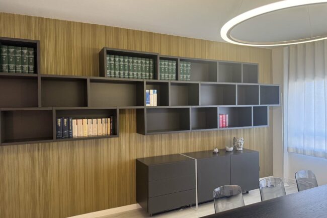 Per lo Studio Notarile Illuzzi abbiamo progettato una libreria su misura che integra contenimento e identità dello spazio di lavoro, con soluzioni funzionali pensate per l’attività quotidiana.