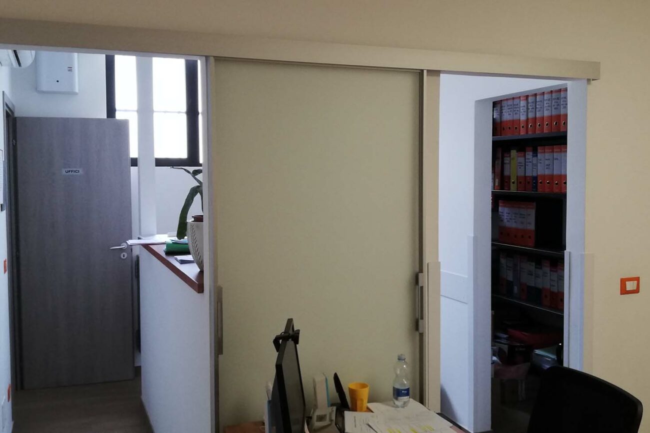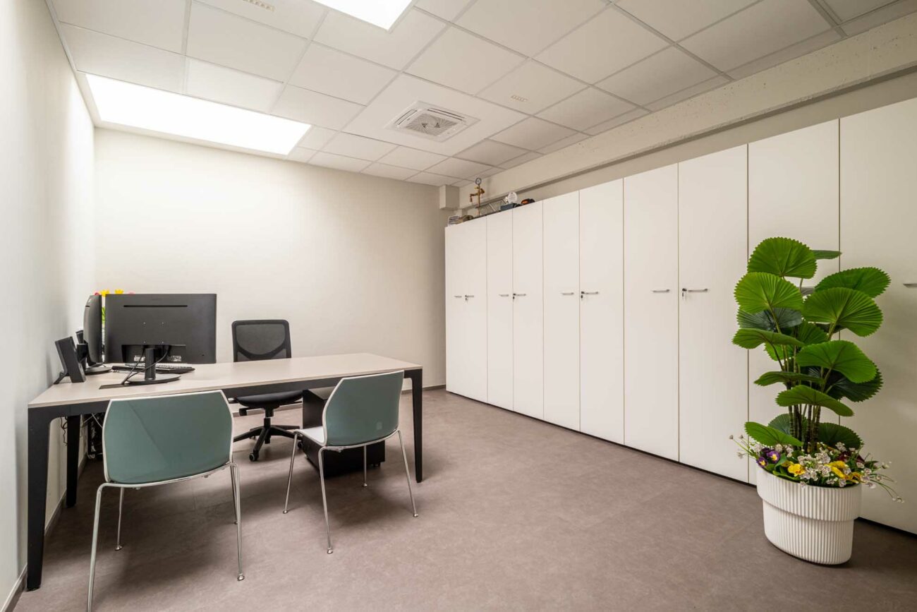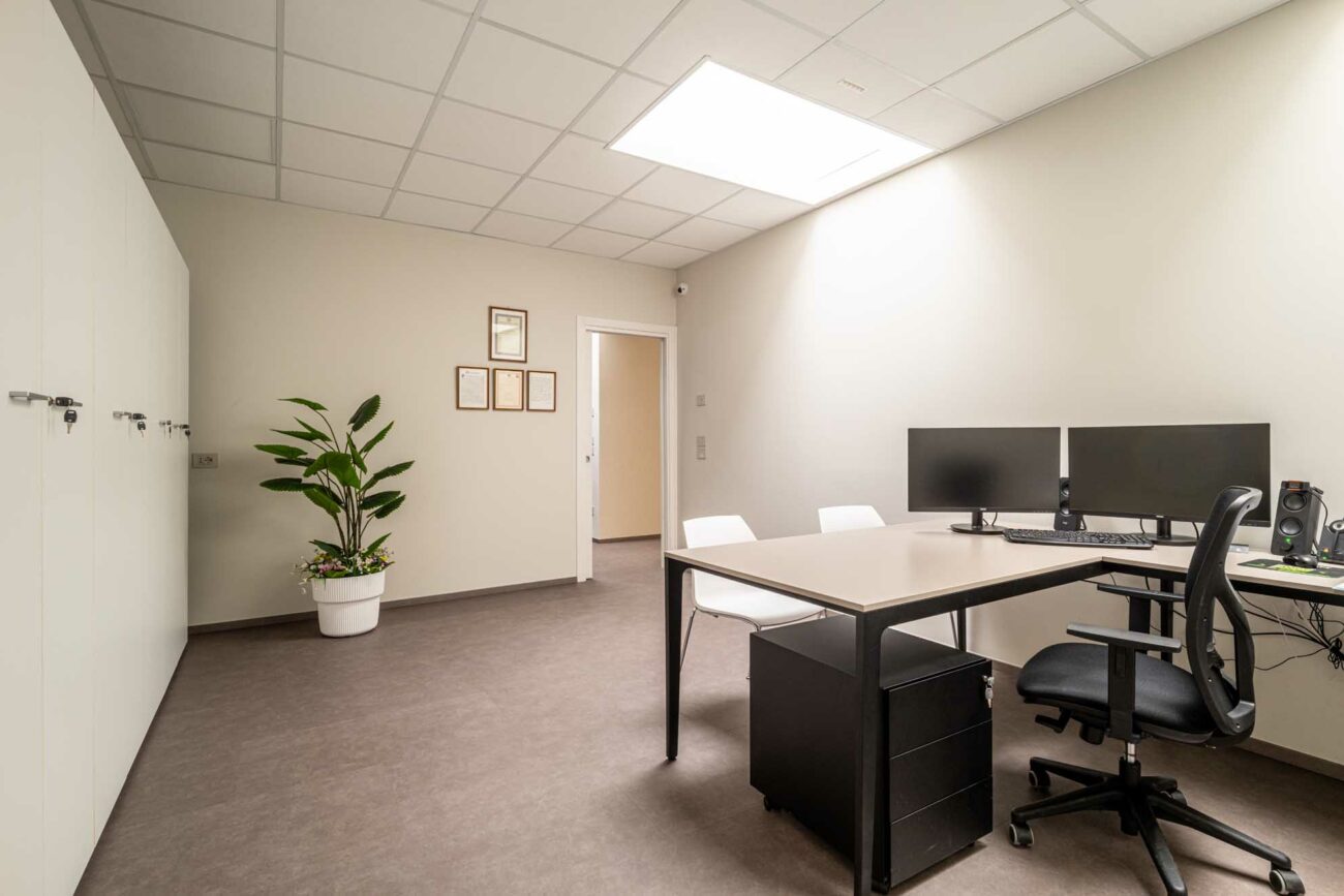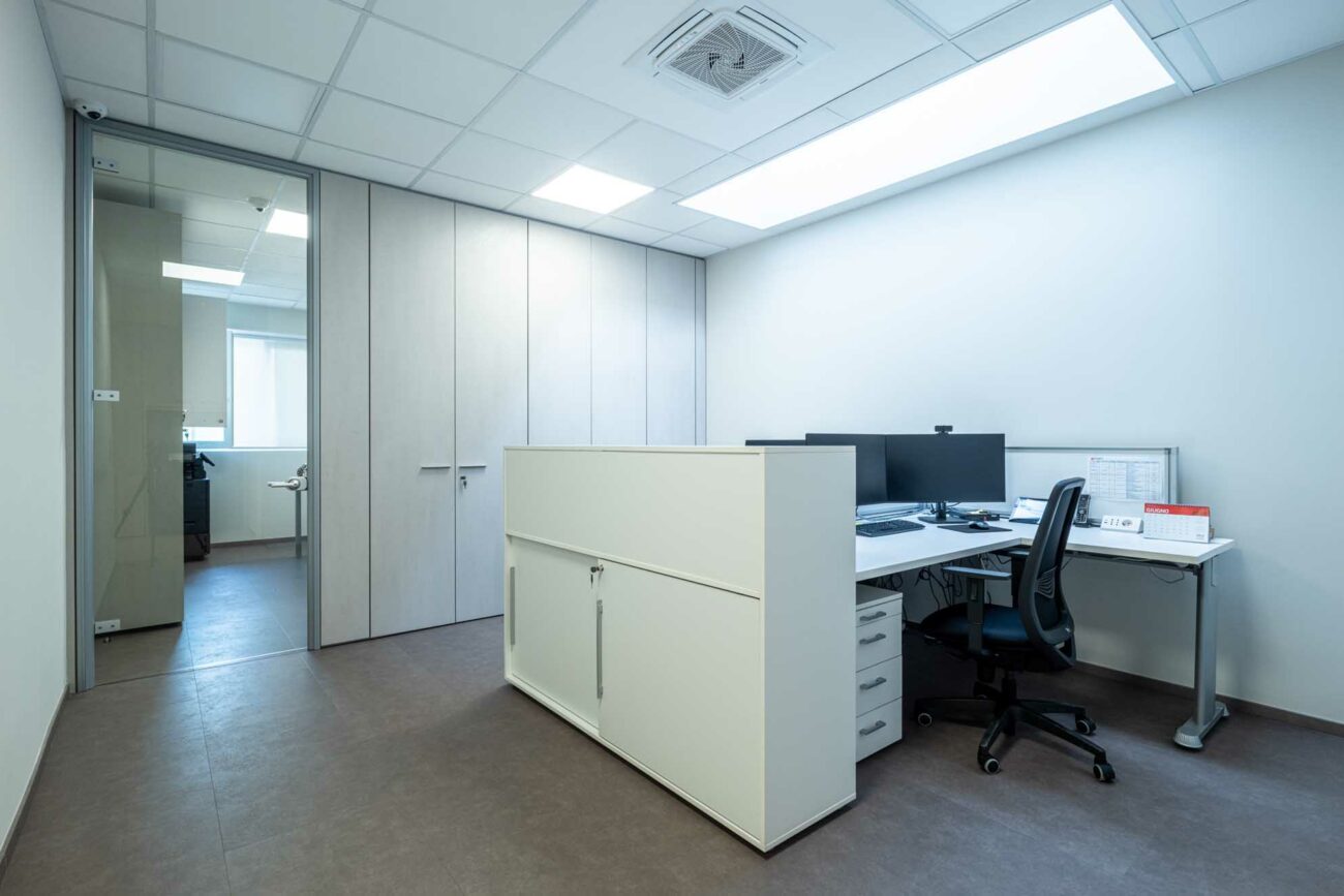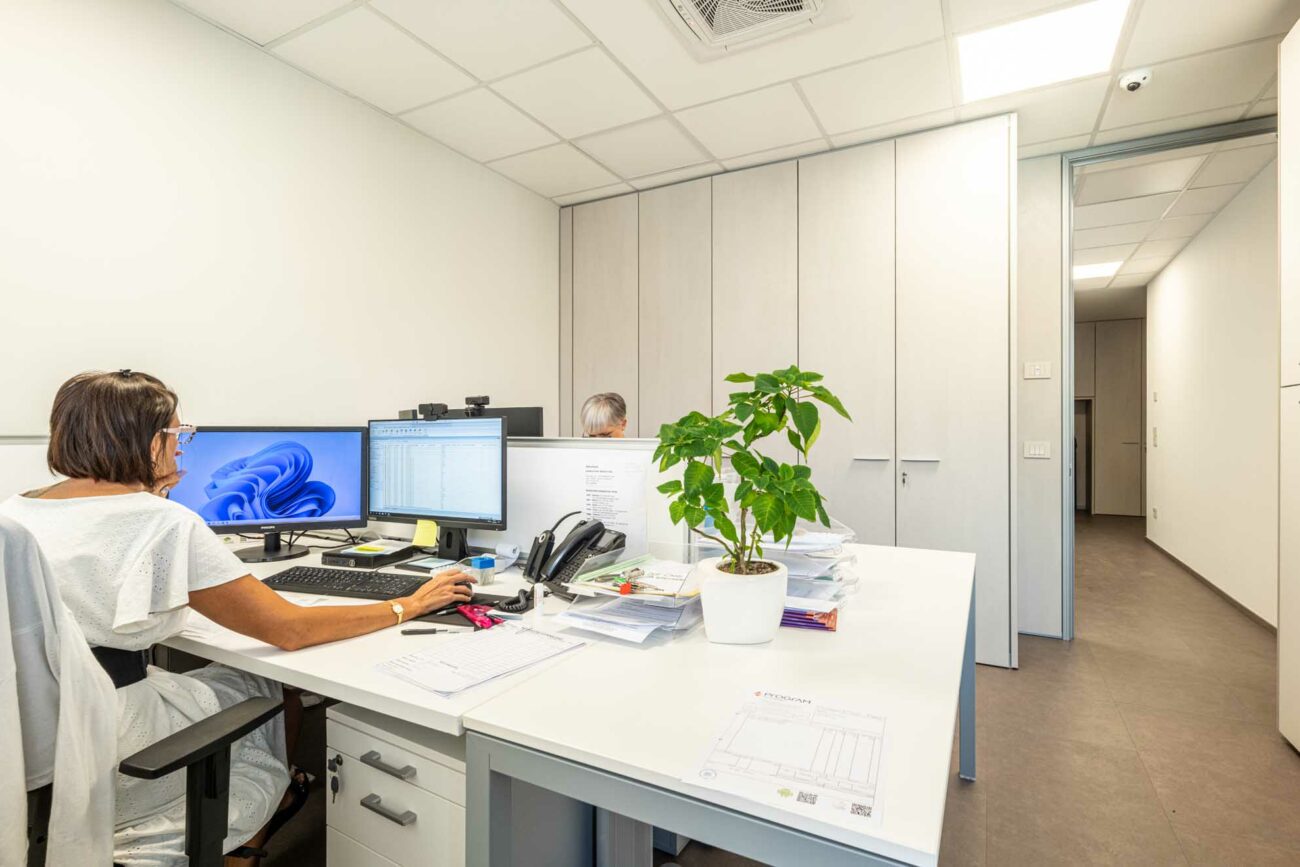 - Ufficio tecnico e ufficio amministrativo, separati da una parete attrezzata bifacciale che garantisce privacy e offre soluzioni di contenimento accessibili da entrambi gli ambienti.