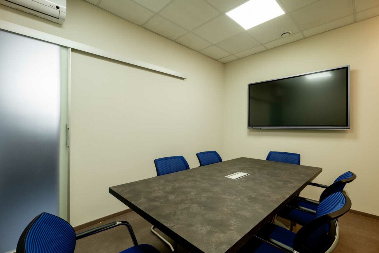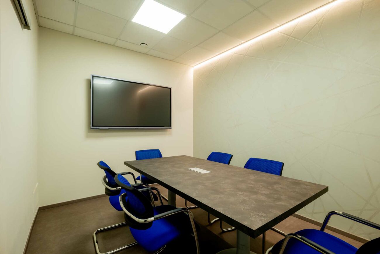 - Sala corsi, uno spazio flessibile con capienza fino a 12 partecipanti, concepito per adattarsi anche a ufficio privato grazie a una postazione di lavoro ampia e funzionale, ideale per un utilizzo direzionale.