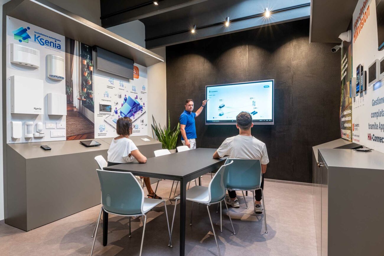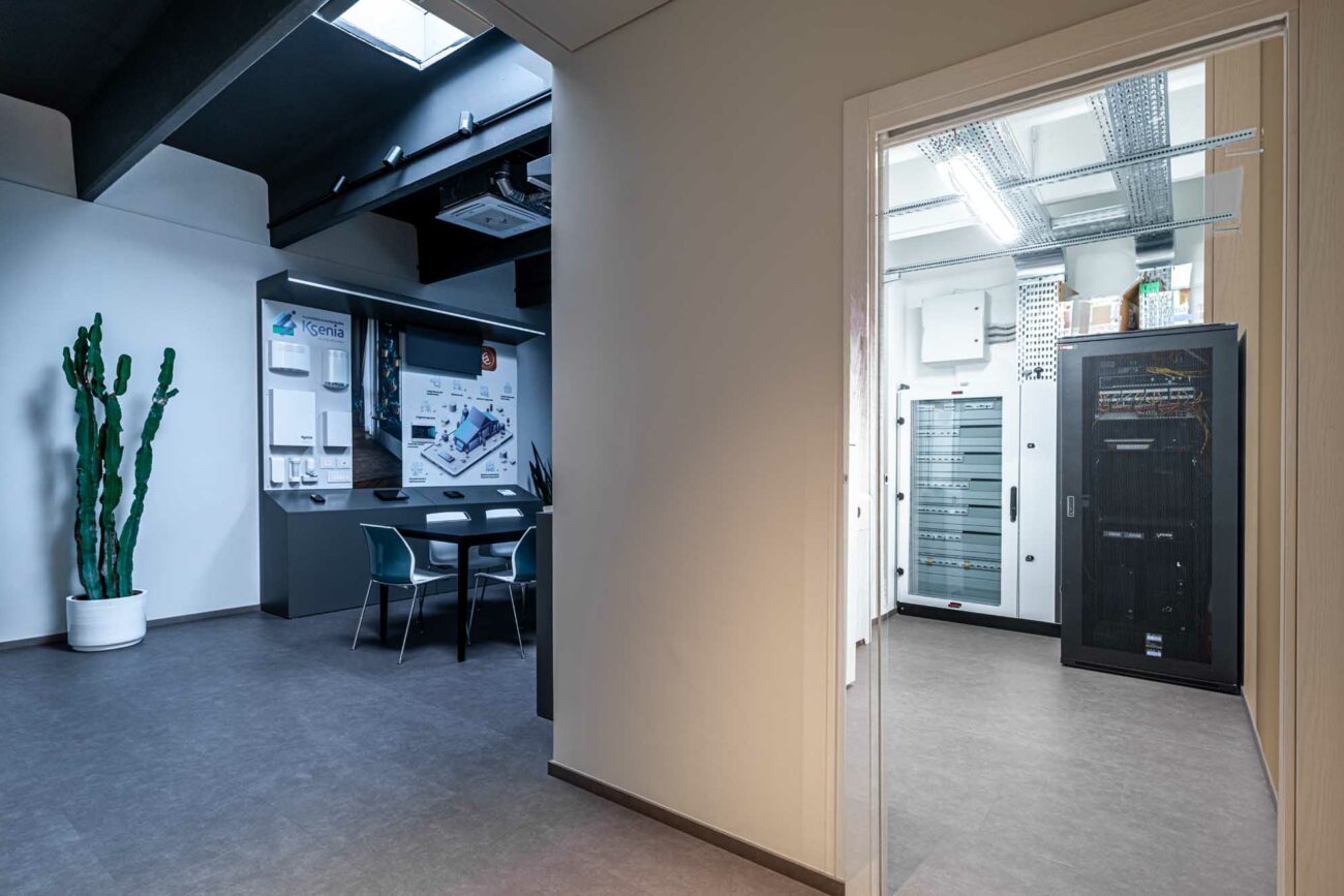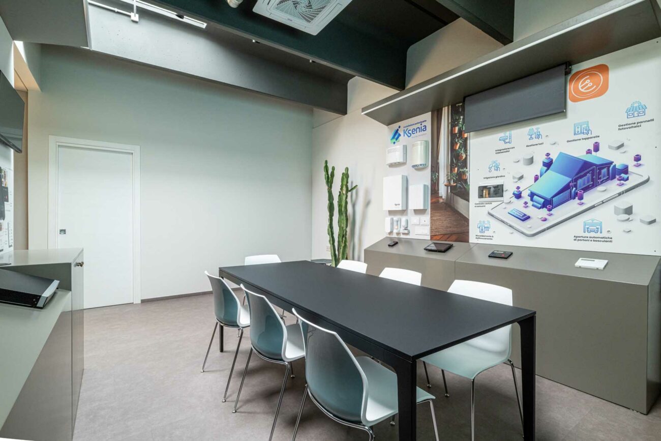 - Showroom aziendale, progettato con espositori su misura e completato da un’area meeting. La parete di fondo, caratterizzata da una finitura scenografica di Resinalab (https://www.resinalab.com/), è attrezzata con schermo per le presentazioni.