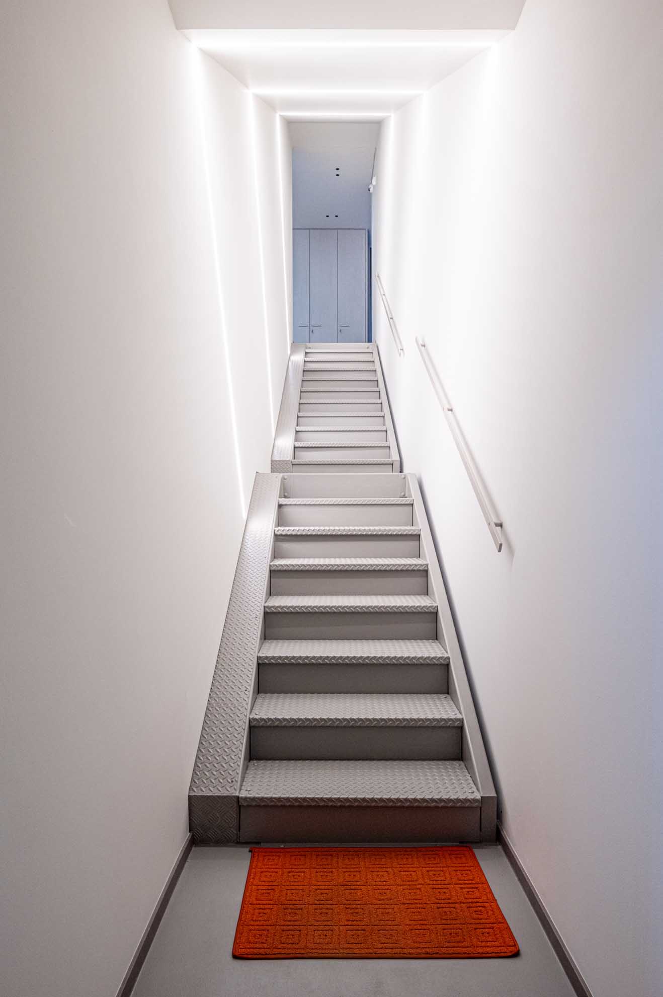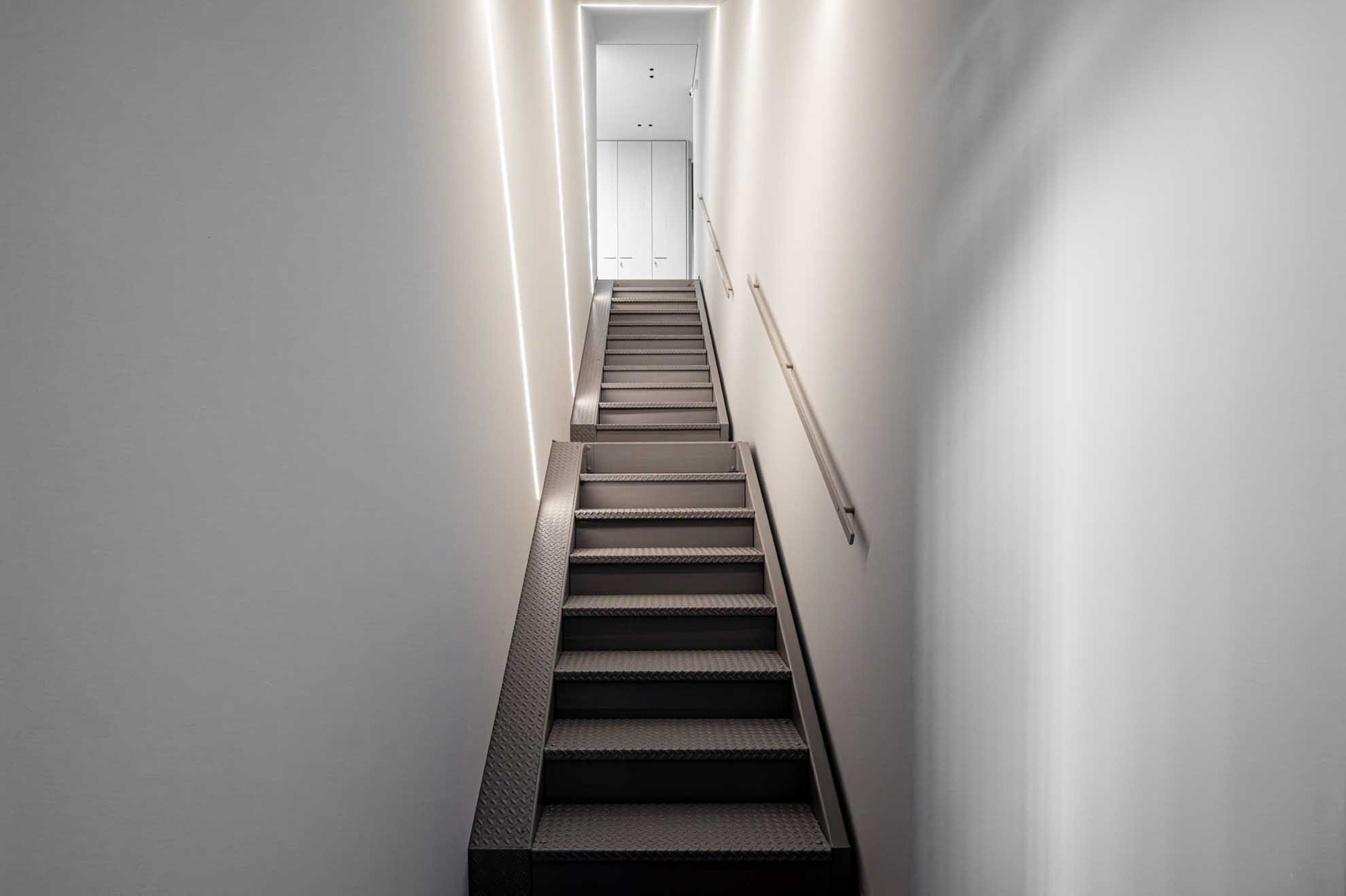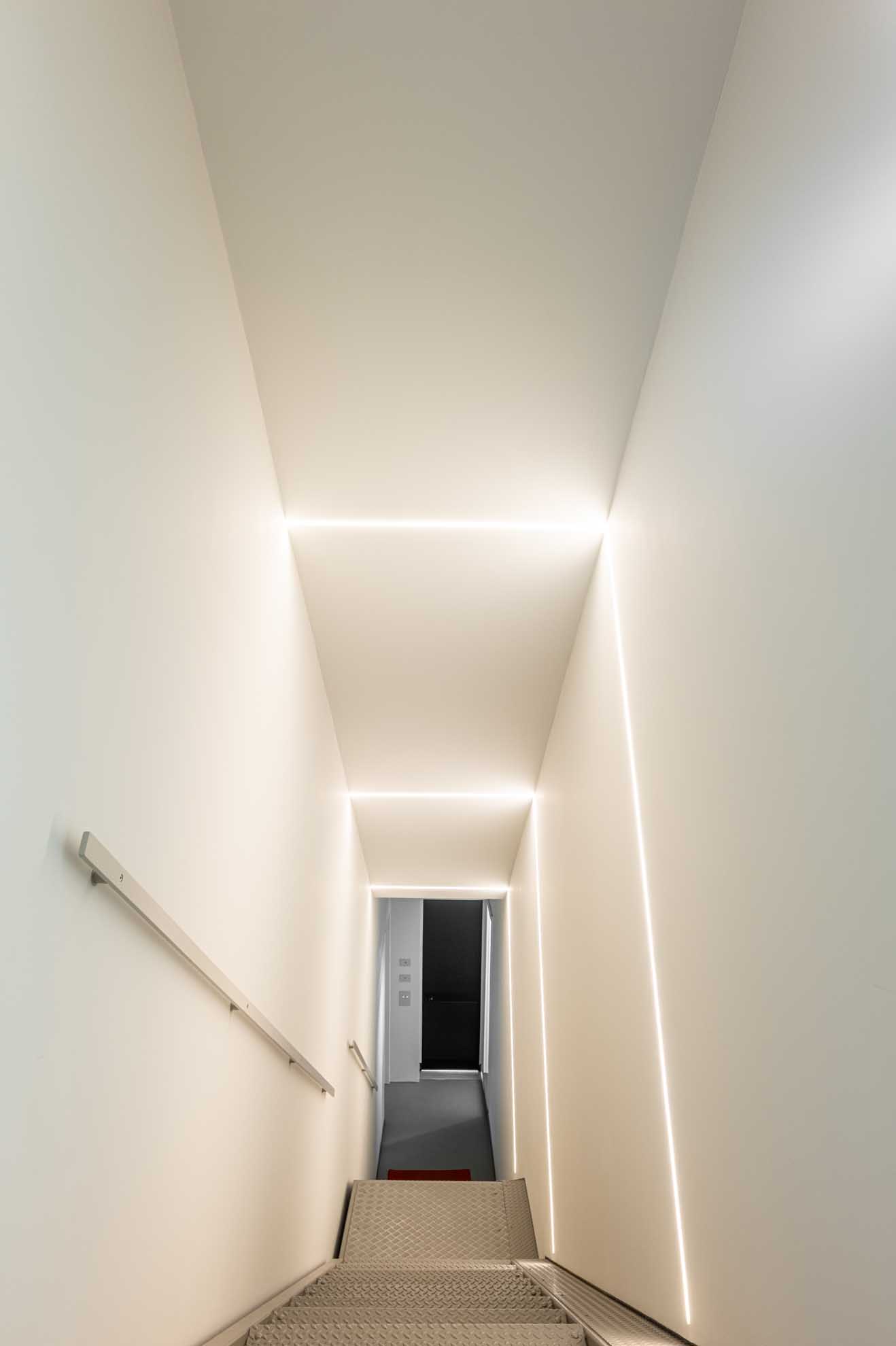 L’ingresso e l’accesso al piano superiore sono caratterizzati da tagli di luce che modellano lo spazio e ne accentuano la dinamica, scomponendo i volumi e modificandone la percezione. La scala in stile industriale è stata mantenuta e valorizzata attraverso l’inserimento di un corrimano realizzato su misura.