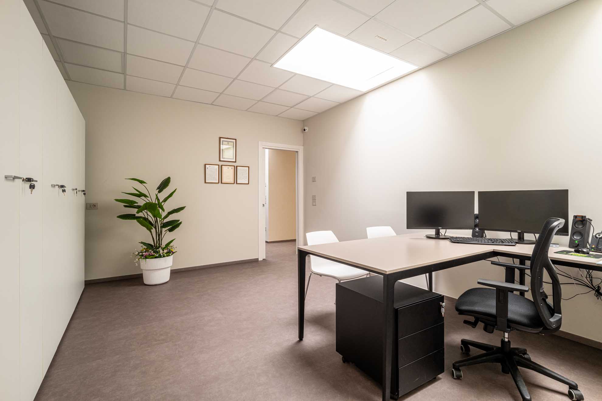 - Ufficio tecnico e ufficio amministrativo, separati da una parete attrezzata bifacciale che garantisce privacy e offre soluzioni di contenimento accessibili da entrambi gli ambienti.