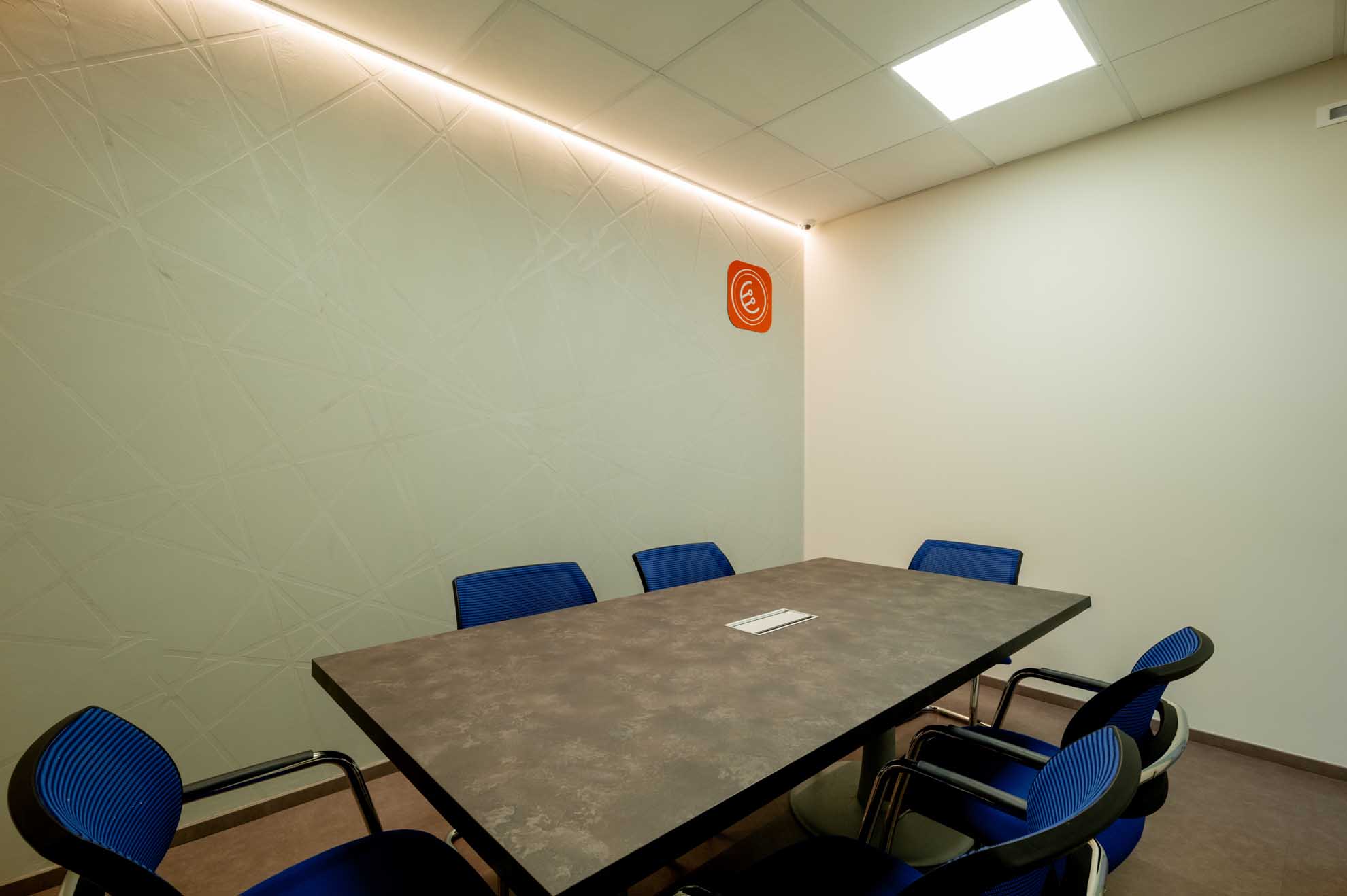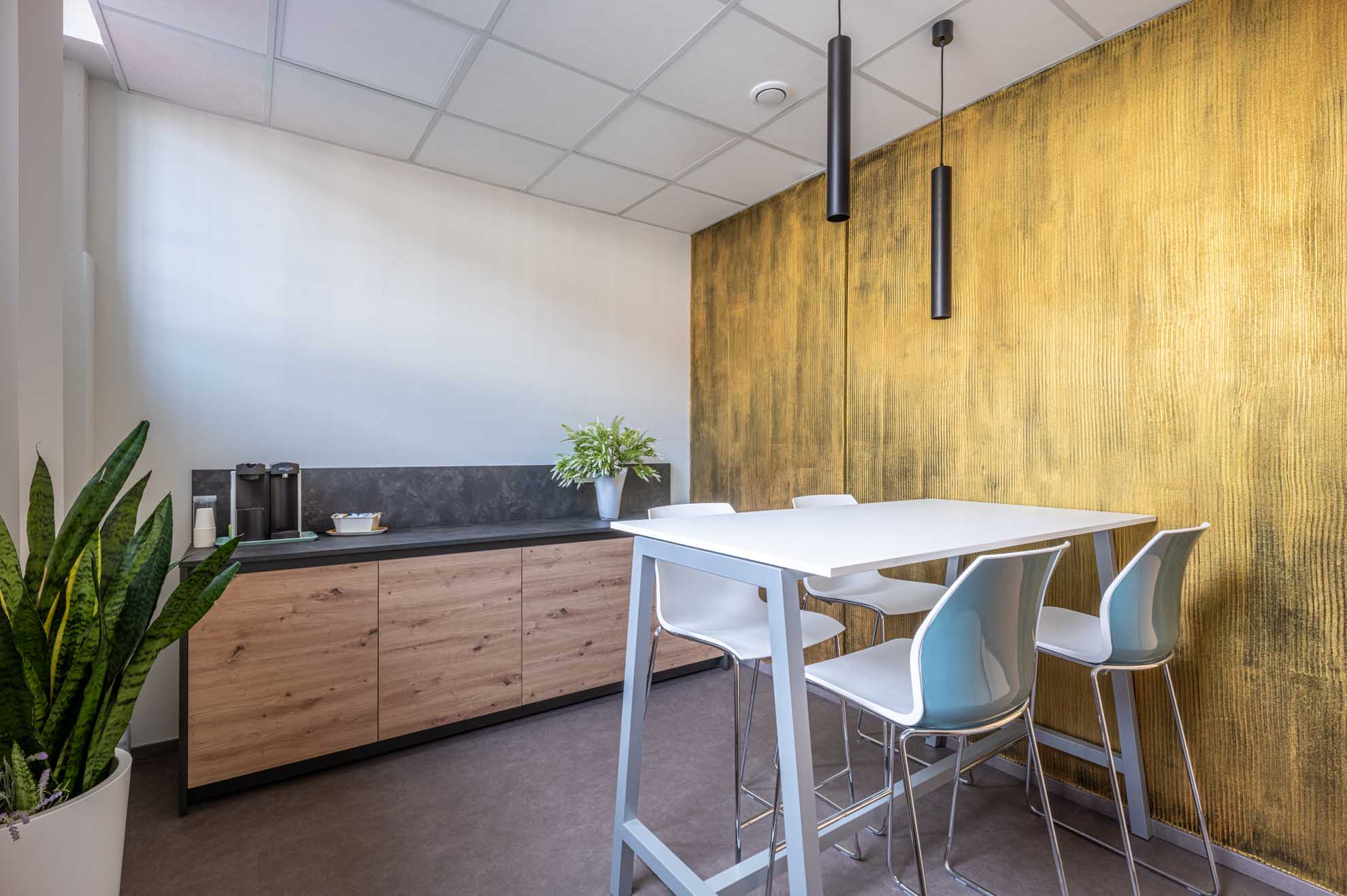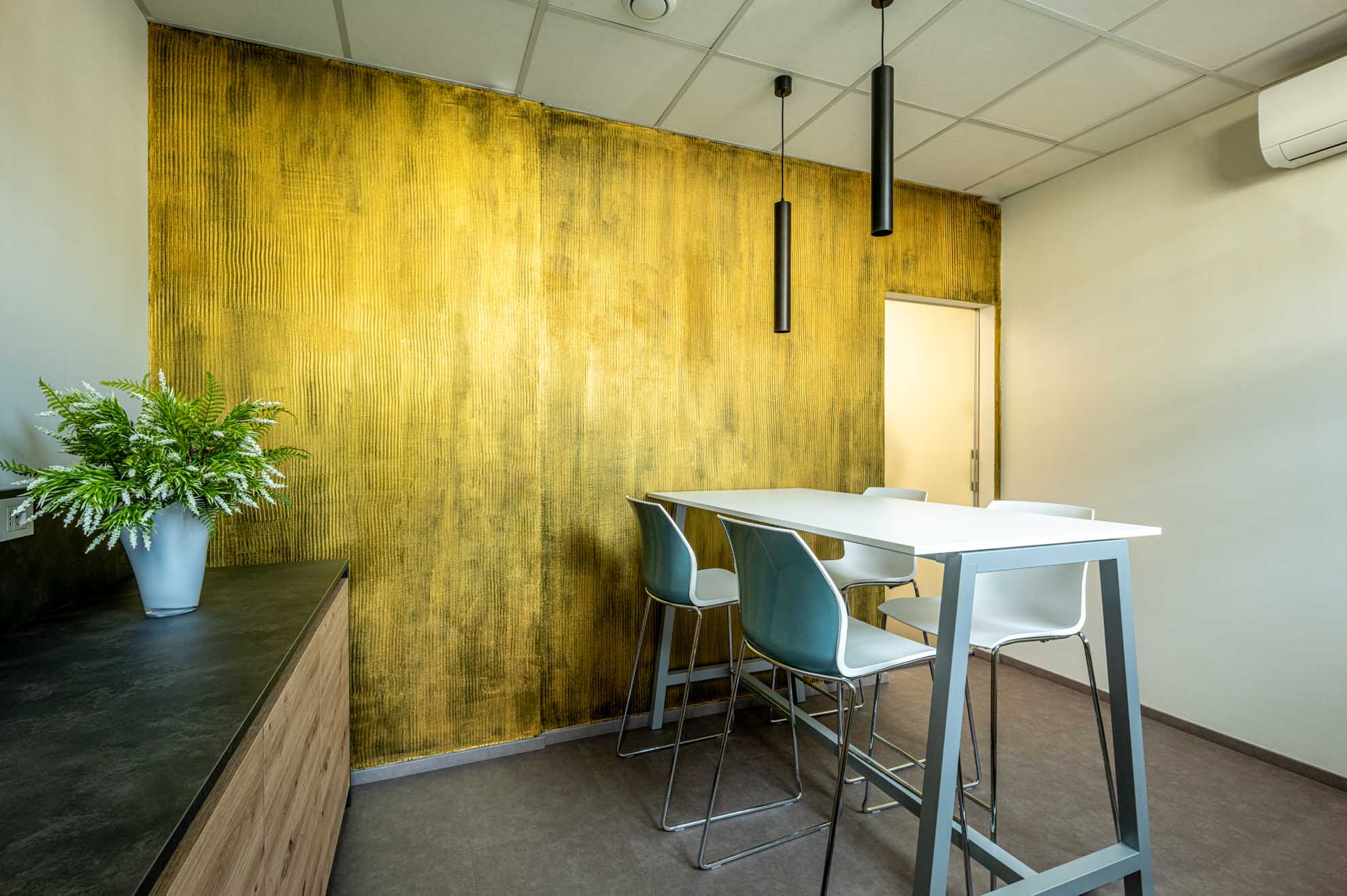 Il piano terra ospita un’accogliente area break, dotata di cucina con frigo e macchina del caffè, tavolo alto e sgabelli, pensata come spazio informale di pausa e condivisione. Adiacente si trova la sala riunioni, attrezzata con schermo per presentazioni e arricchita da una parete decorativa – realizzata da Resinalab – che richiama e rafforza l’identità visiva dell’azienda.