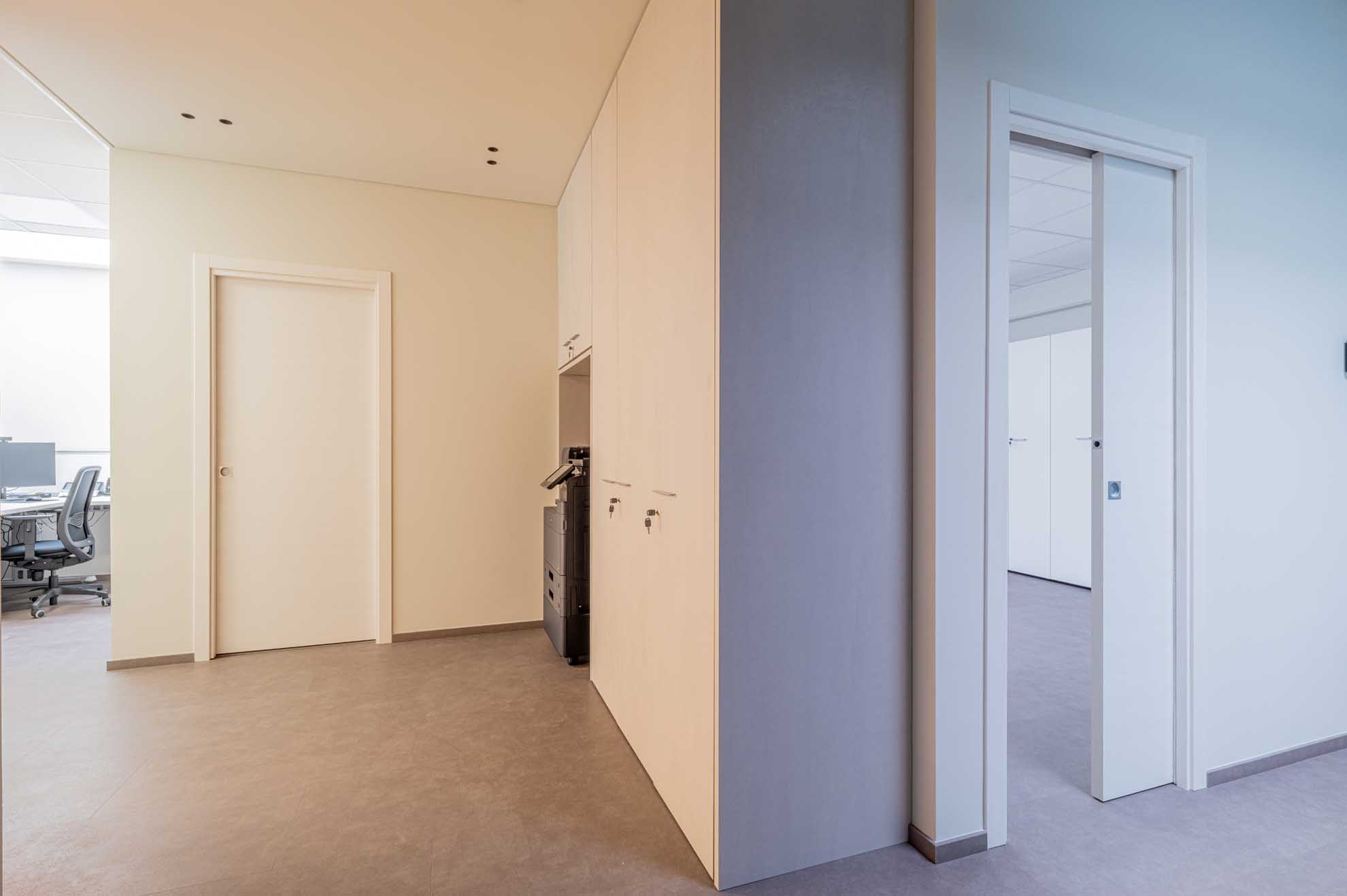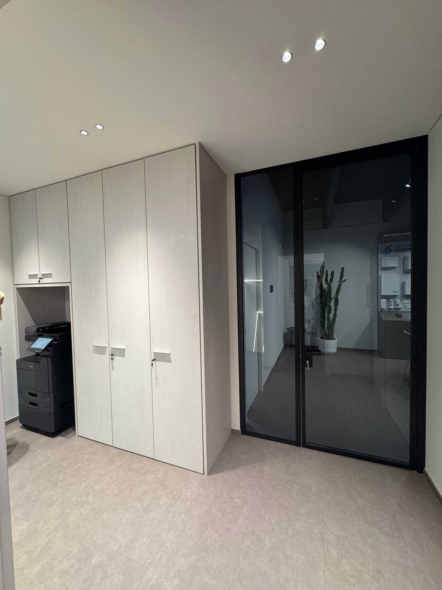 Nel disimpegno di accesso al piano è stato ricavato uno spazio dedicato al fotocopiatore, posizionato in modo ergonomico per l’operatore. È inoltre presente un vano tecnico, progettato per facilitare l’accessibilità e le operazioni di manutenzione.