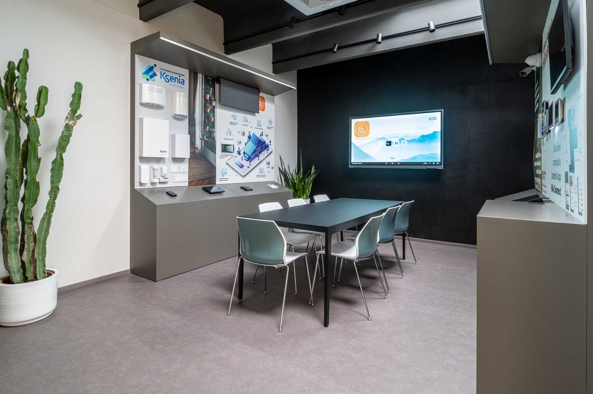 - Showroom aziendale, progettato con espositori su misura e completato da un’area meeting. La parete di fondo, caratterizzata da una finitura scenografica di Resinalab (https://www.resinalab.com/), è attrezzata con schermo per le presentazioni.