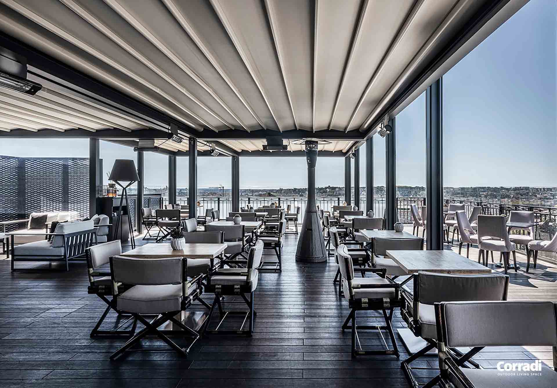 Le pergole bioclimatiche Corradi, realizzate in alluminio, offrono una copertura con lamelle orientabili, azionabili tramite radiocomando o manualmente. La loro rotazione permette di modulare luce e ventilazione naturale, creando un microclima personalizzato, mentre garantiscono protezione dalle intemperie quando chiuse. Corradi coniuga in queste strutture funzionalità avanzate con un design raffinato ed elegante.