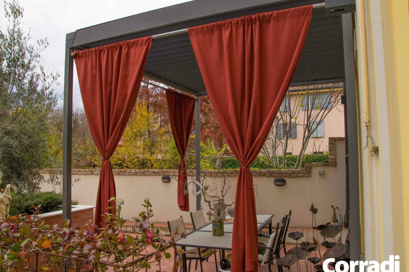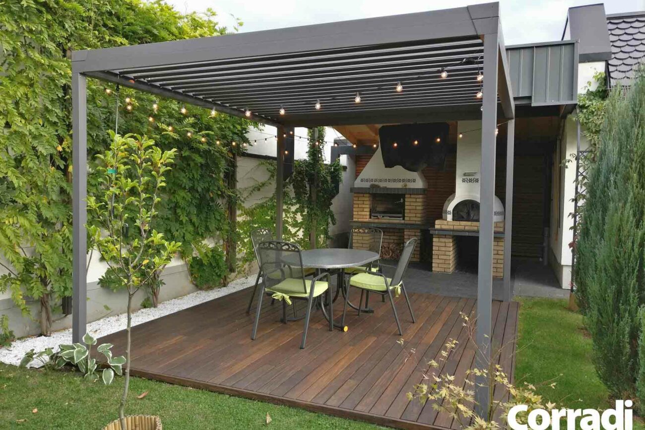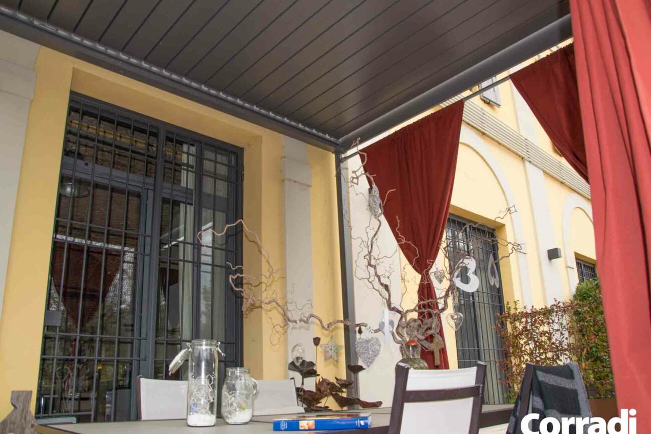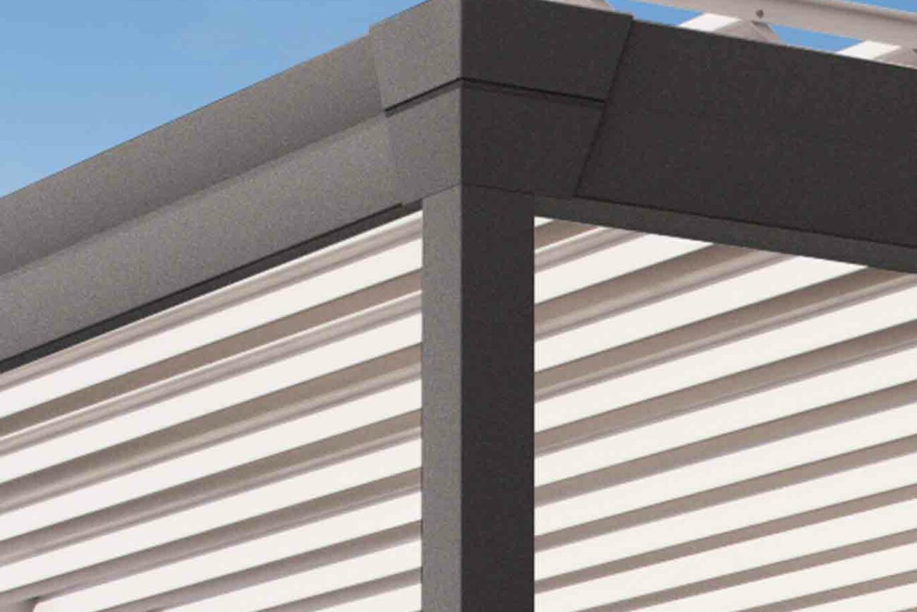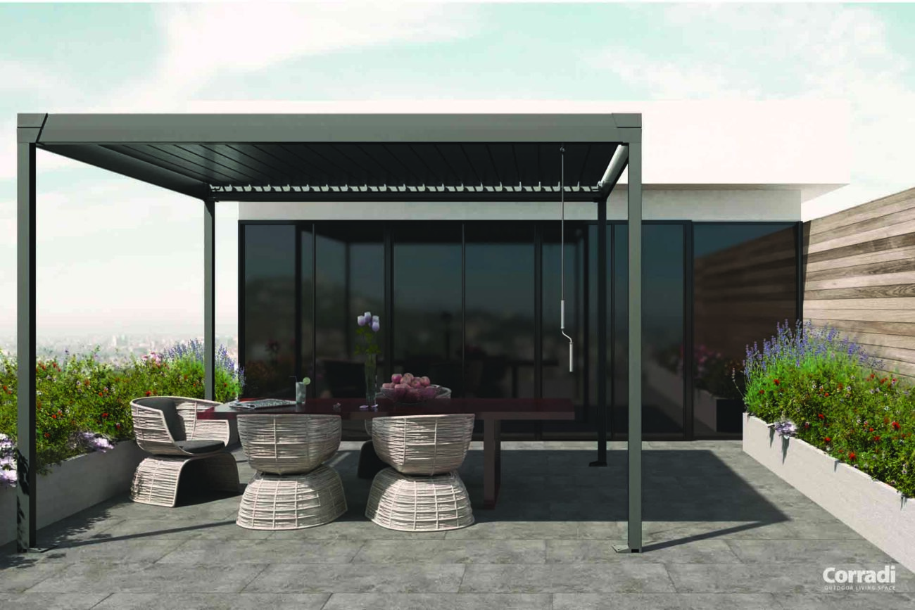 Eteria è pratica, adattabile e semplice da installare. Perfetta per spazi esterni privati di grandi dimensioni, la sua struttura può essere sia raddoppiata in larghezza che in profondità , sia nella versione autoportante che addossata a parete. In ogni modulo, anche quando accoppiati, la copertura bioclimatica può essere orientata autonomamente, dimostrando l’estrema versatilità e funzionalità di questa pergola. Ogni pergola Eteria beneficia della garanzia Corradi, valida al 100% per tutta la durata prevista: in questo caso, 2 anni.