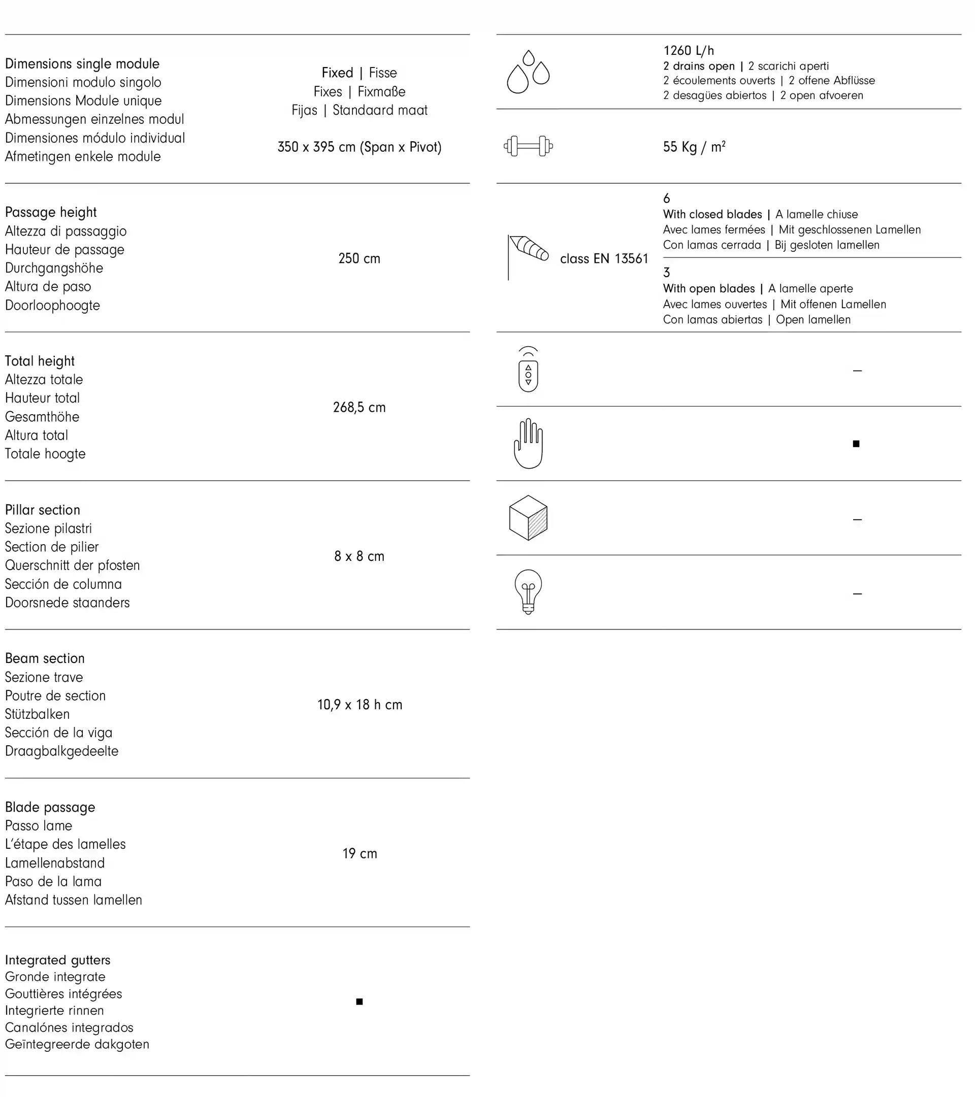 Il movimento delle lamelle, che possono ruotare fino a 120°, è completamente manuale. Pertanto, Eteria non richiede elettricità e il suo design, privo di motore, è estremamente sobrio ed essenziale. Le lamelle piane contribuiscono significativamente all’estetica minimalista della pergola, risultando parzialmente visibili anche ad apertura totale. La leggera struttura di Eteria, realizzata in alluminio, è notevolmente resistente all’acqua quando completamente chiusa, grazie alle grondaie integrate nei travi e nei pilastri. La sua resistenza alle condizioni climatiche marittime la rende ideale per ambienti esterni in prossimità del mare, se correttamente mantenuta.