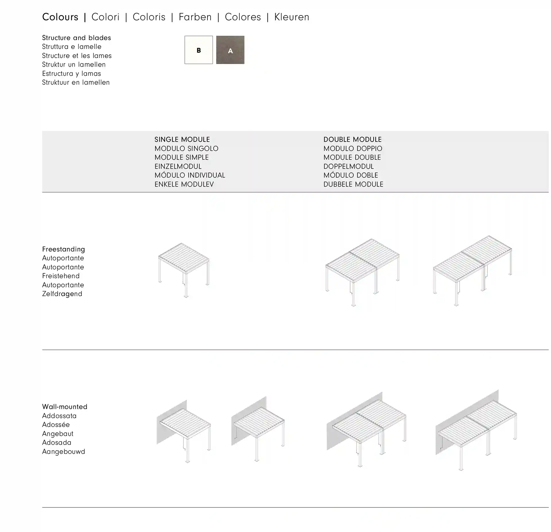 Durante l’acquisto, è possibile definire la direzione di apertura delle lamelle. Questa caratteristica consente di scegliere tra una maggiore protezione dal sole o la massima luminosità possibile nello spazio sottostante, adattandosi alle esigenze climatiche o ai gusti personali. Anche l’illuminazione del pergolato può essere personalizzata, con la scelta tra componenti fissi, come le luci da pavimento, o soluzioni più semplici ma di grande impatto visivo.