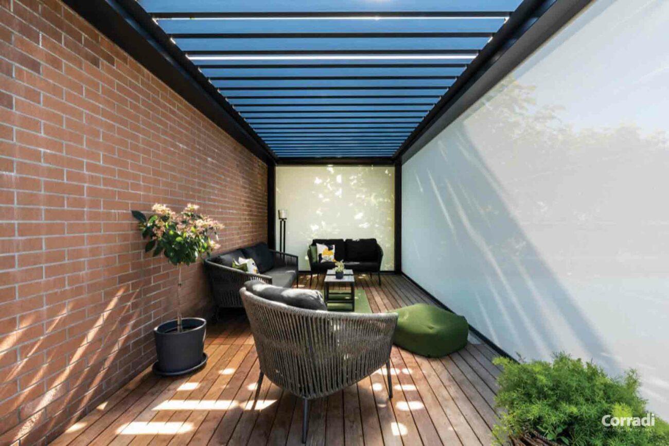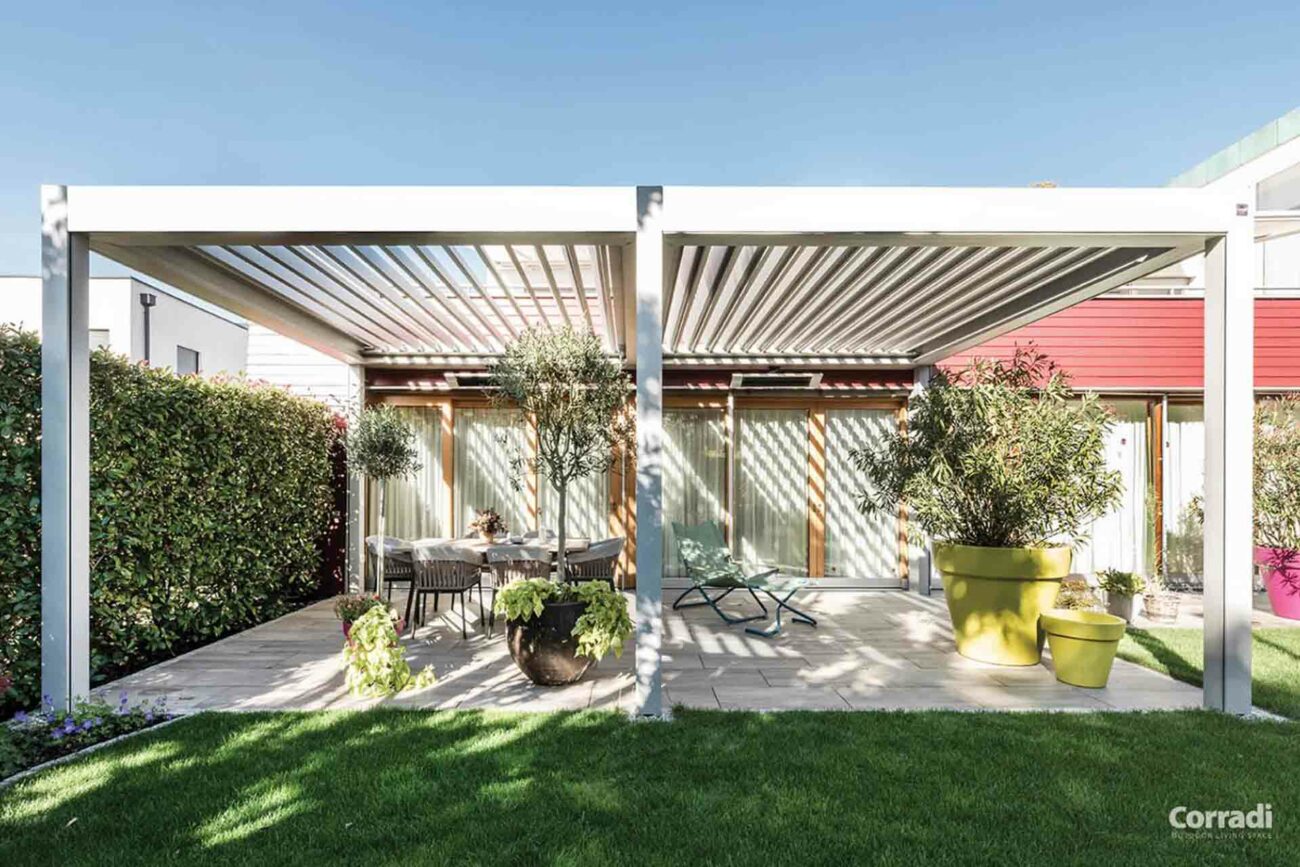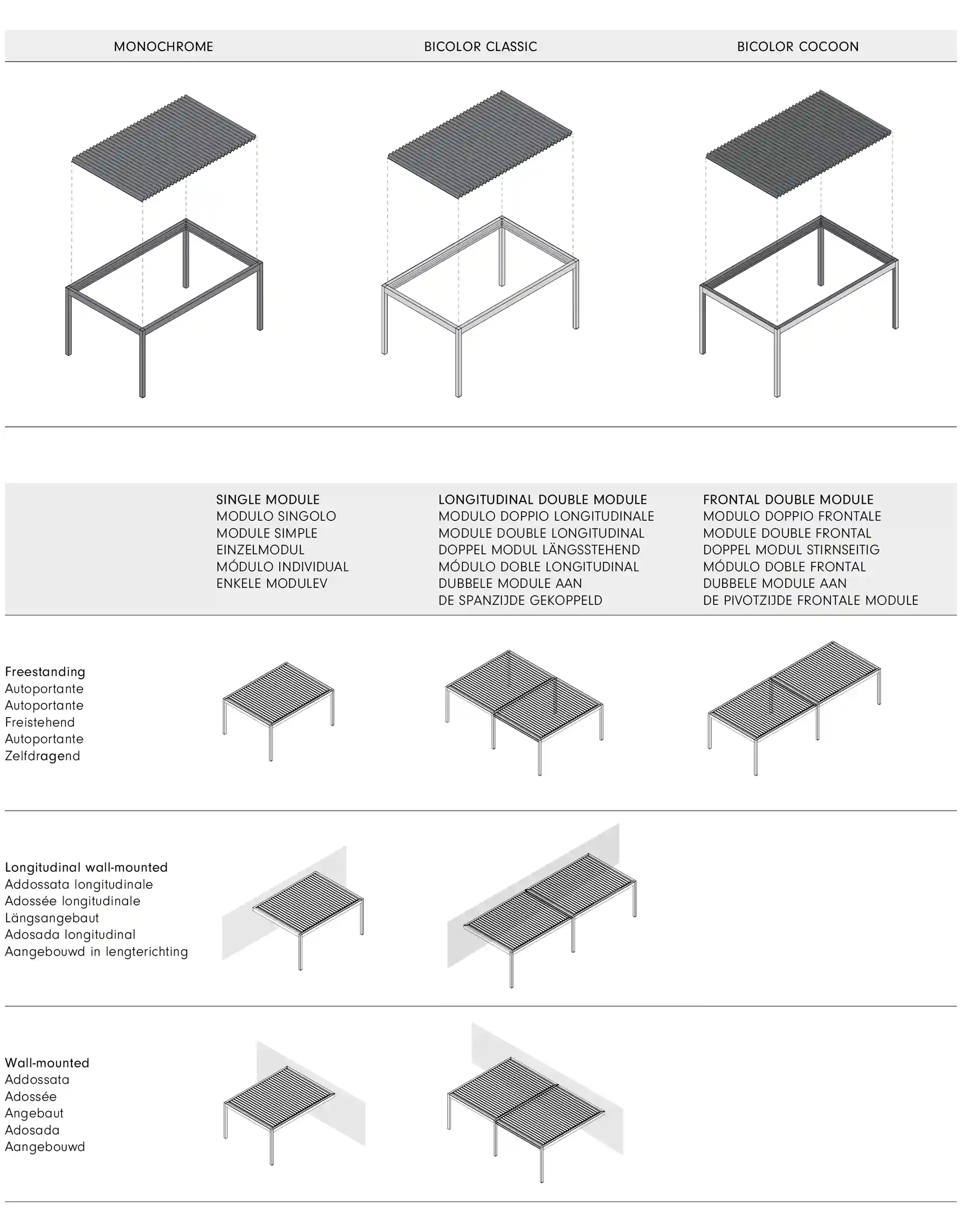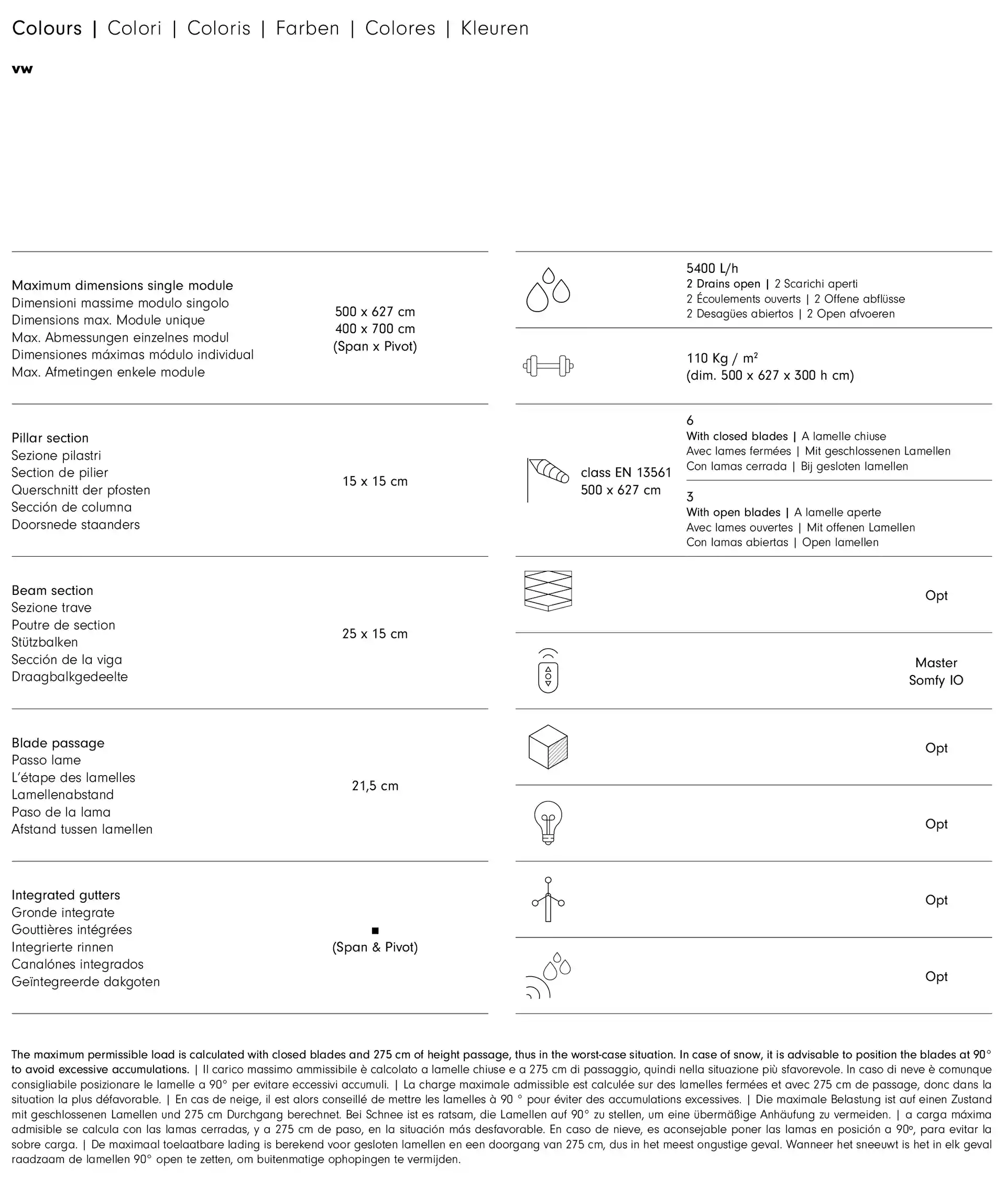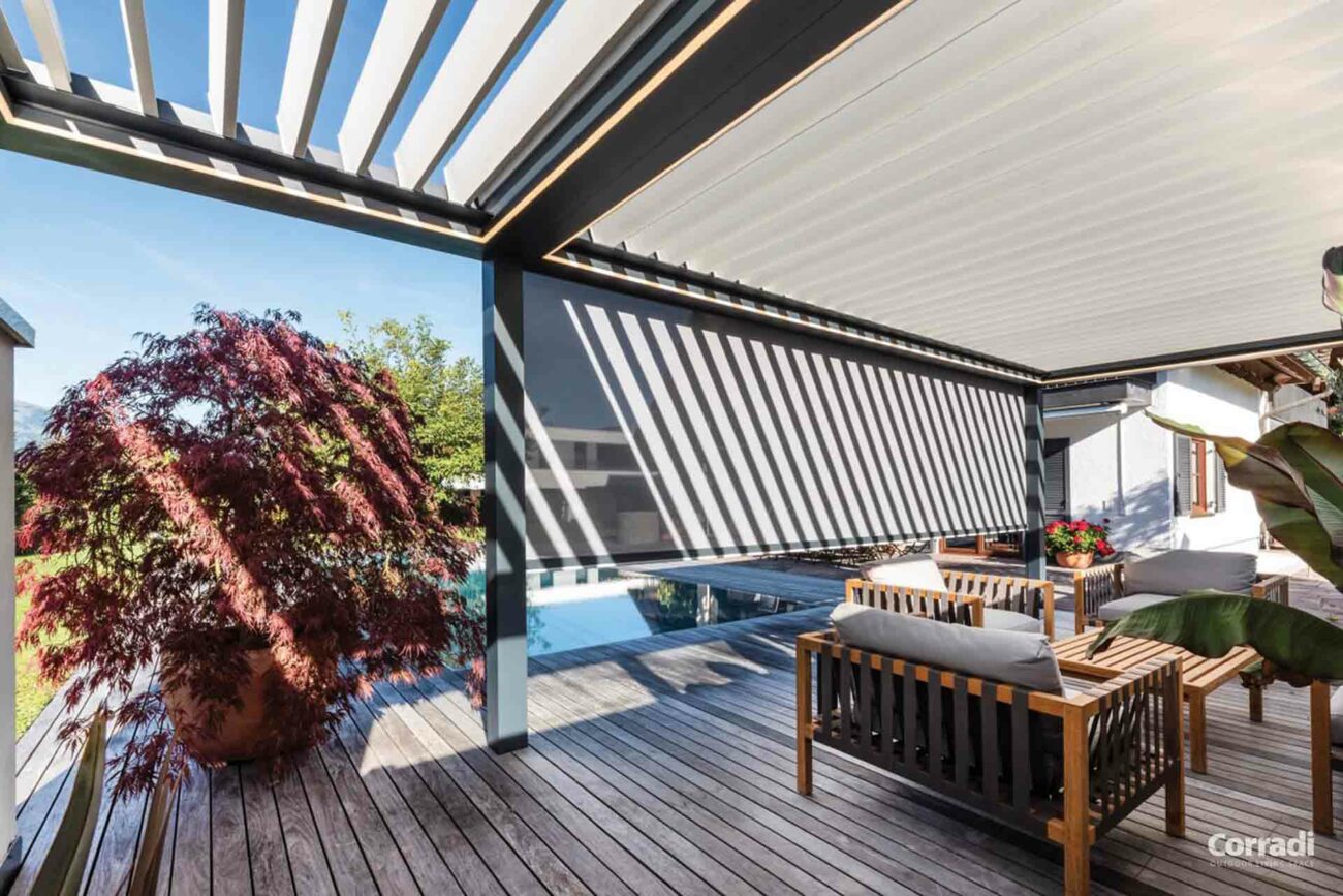 Imago offre una soluzione con lamelle orientabili fino a 135°, con elementi costruttivi autosufficienti: pedana, pilastri, travi, tutti in piena continuità architettonica. Il design si distingue per la sua estrema pulizia e coerenza, con pilastri che servono come pluviale per il deflusso dell’acqua e come guide laterali per gli schermi, minimizzando l’ingombro.