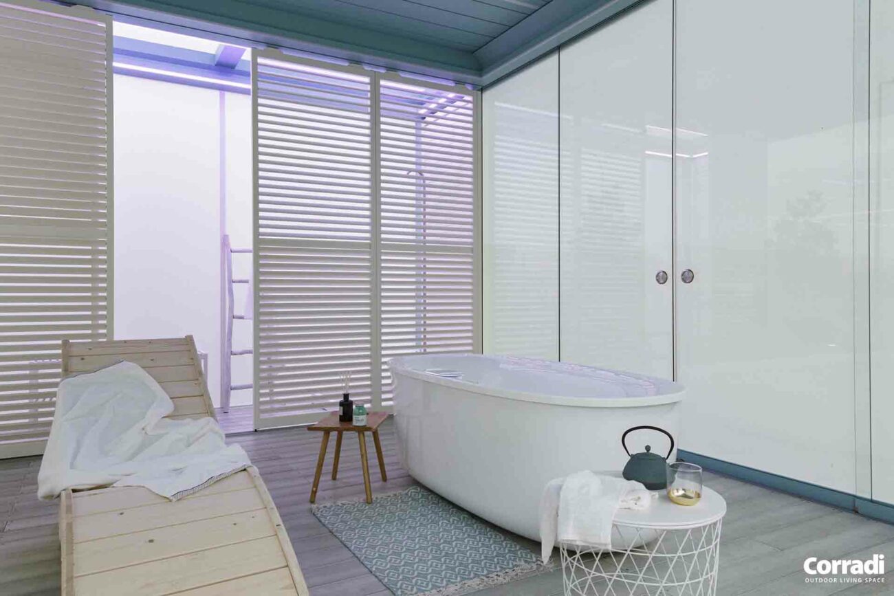 La gronda permette di integrare luci LED su tutto il perimetro interno, creando un sistema di illuminazione modulabile ed esteticamente piacevole. La speciale geometria di travi e pilastri consente a Imago di offrire una finitura esterna di colore completamente diverso da quella interna, creando un effetto bicolor originale e accogliente.