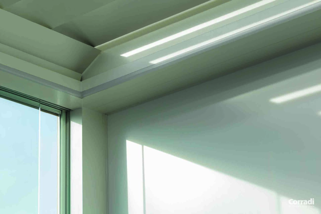 Le travi, pensate per integrare tutte le chiusure della gamma, nascondono alla vista ogni discontinuità. Così, anche la barra di comando del sistema a lamelle trova collocazione sul lato interno della trave, proteggendo il meccanismo di azionamento motorizzato e massimizzando estetica e funzionalità. Le lamelle, completamente ridisegnate, offrono una risposta al desiderio di pulizia e continuità delle linee e possono accogliere luci LED dimmerabili, perfettamente centrate rispetto alla larghezza della lama.