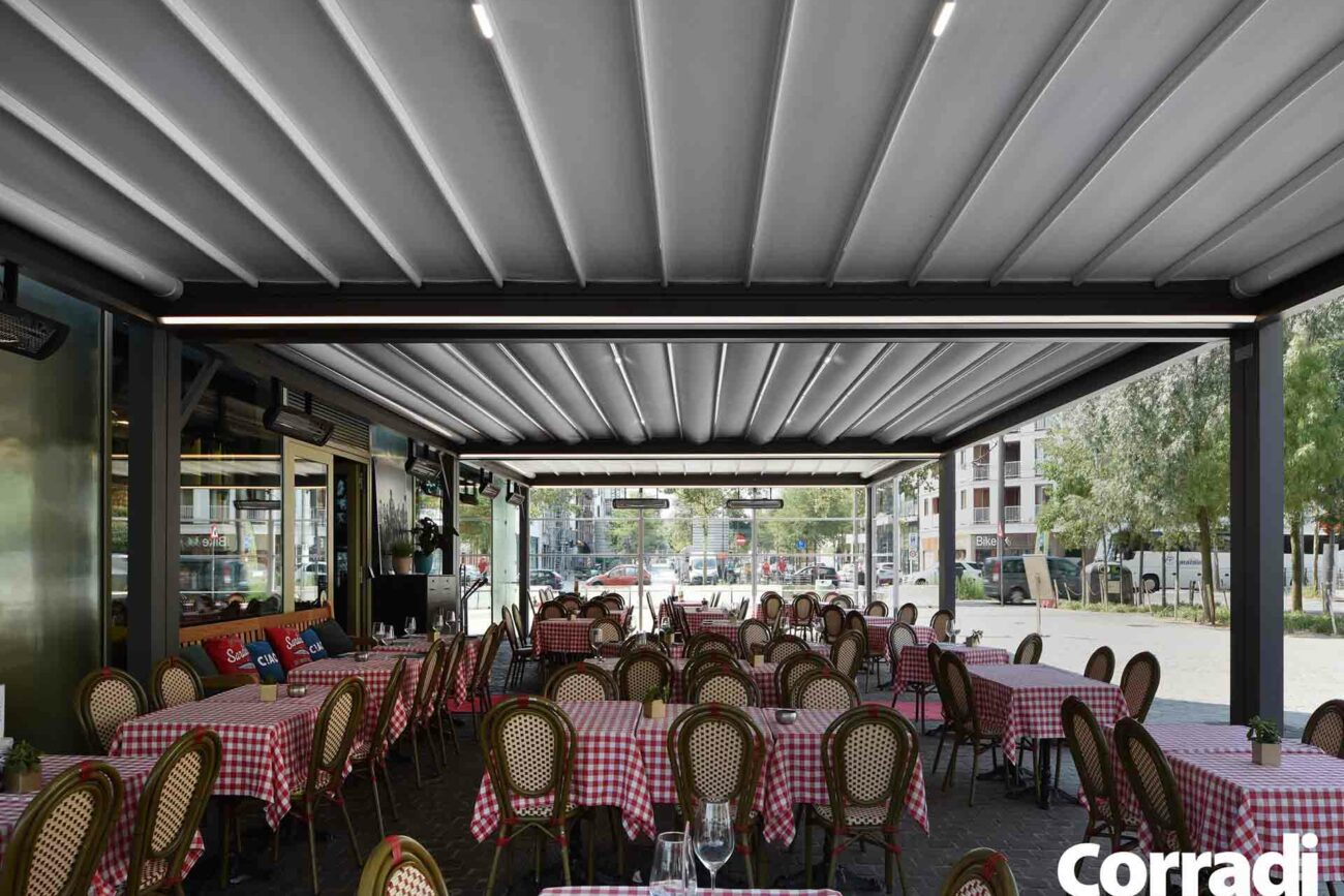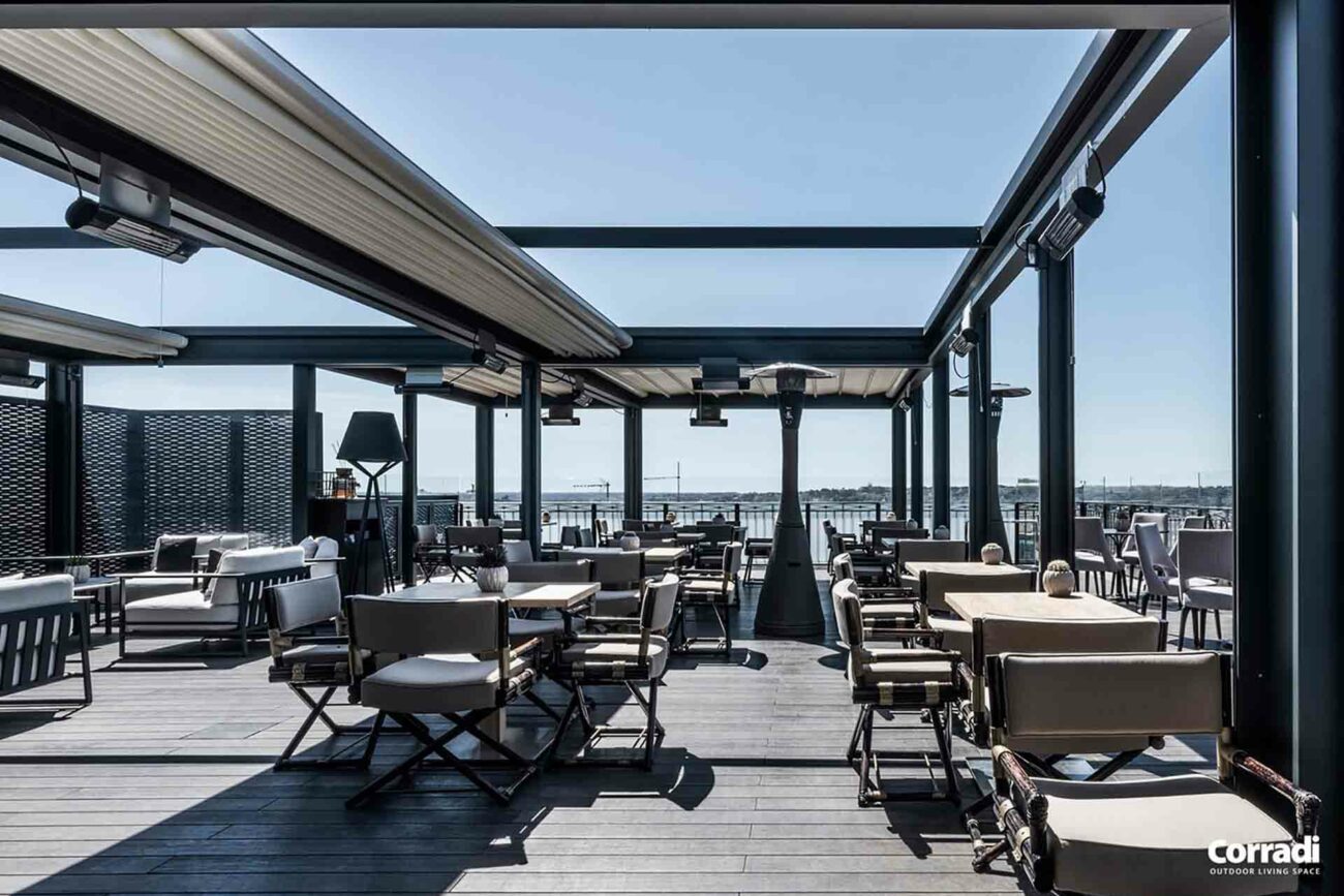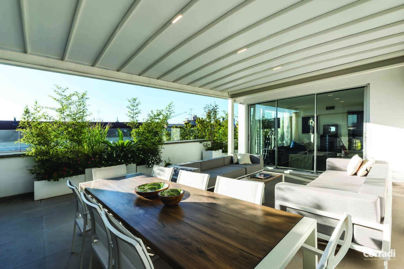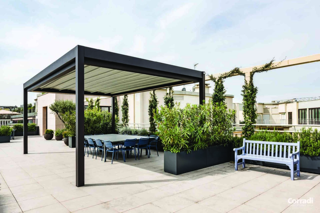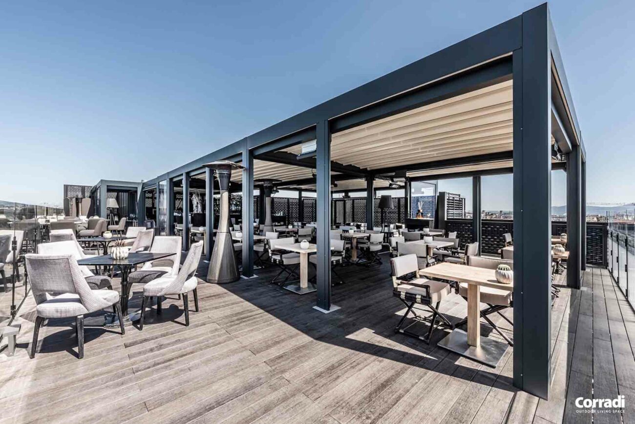 Maestro rappresenta inoltre la soluzione perfetta per il settore contract, rispondendo all’esigenza di un pergolato per il dehor o per il giardino. Entrambe le configurazioni, con telo o lamelle orientabili, permettono di accoppiare le strutture senza raddoppiare il pilastro, coprendo efficacemente e con eleganza anche superfici considerevoli.