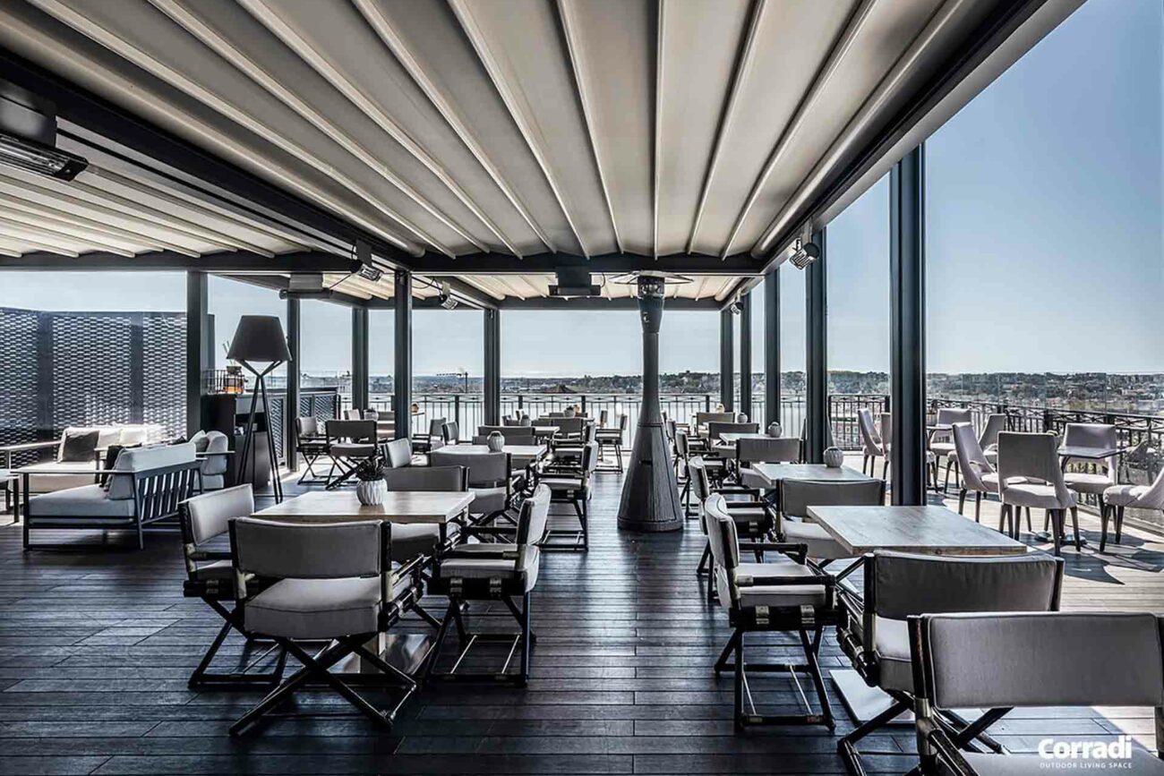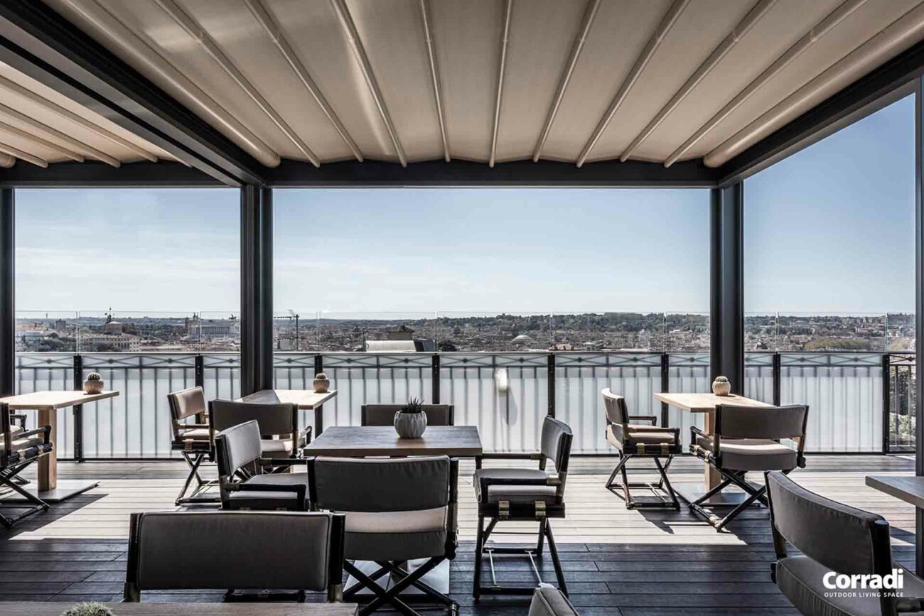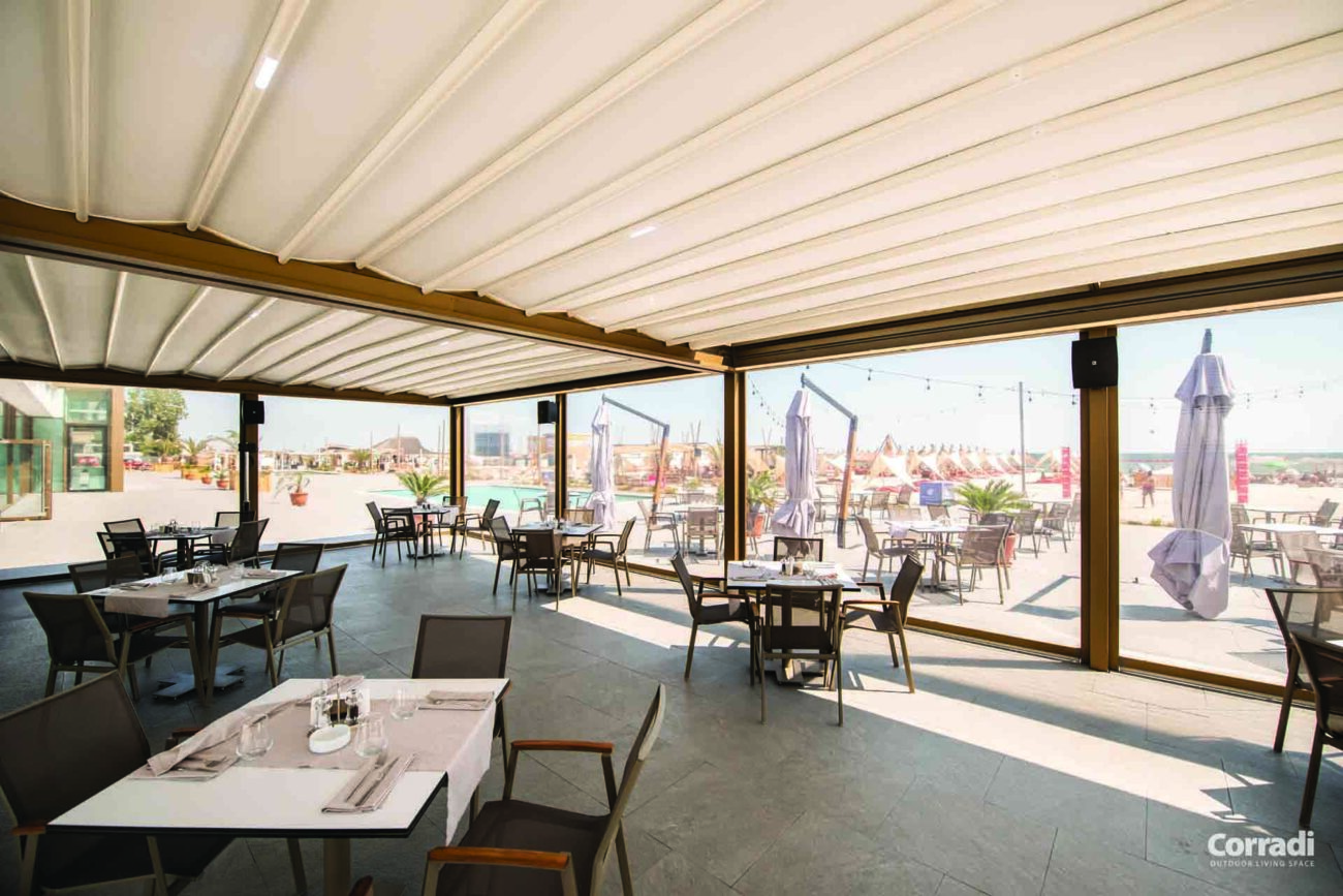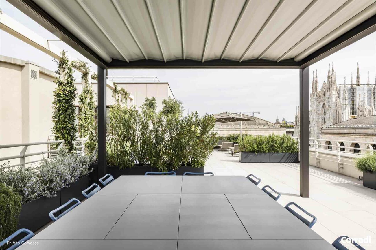 Maestro rappresenta inoltre la soluzione perfetta per il settore contract, rispondendo all’esigenza di un pergolato per il dehor o per il giardino. Entrambe le configurazioni, con telo o lamelle orientabili, permettono di accoppiare le strutture senza raddoppiare il pilastro, coprendo efficacemente e con eleganza anche superfici considerevoli.