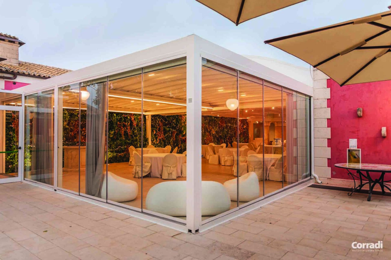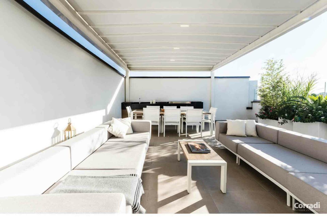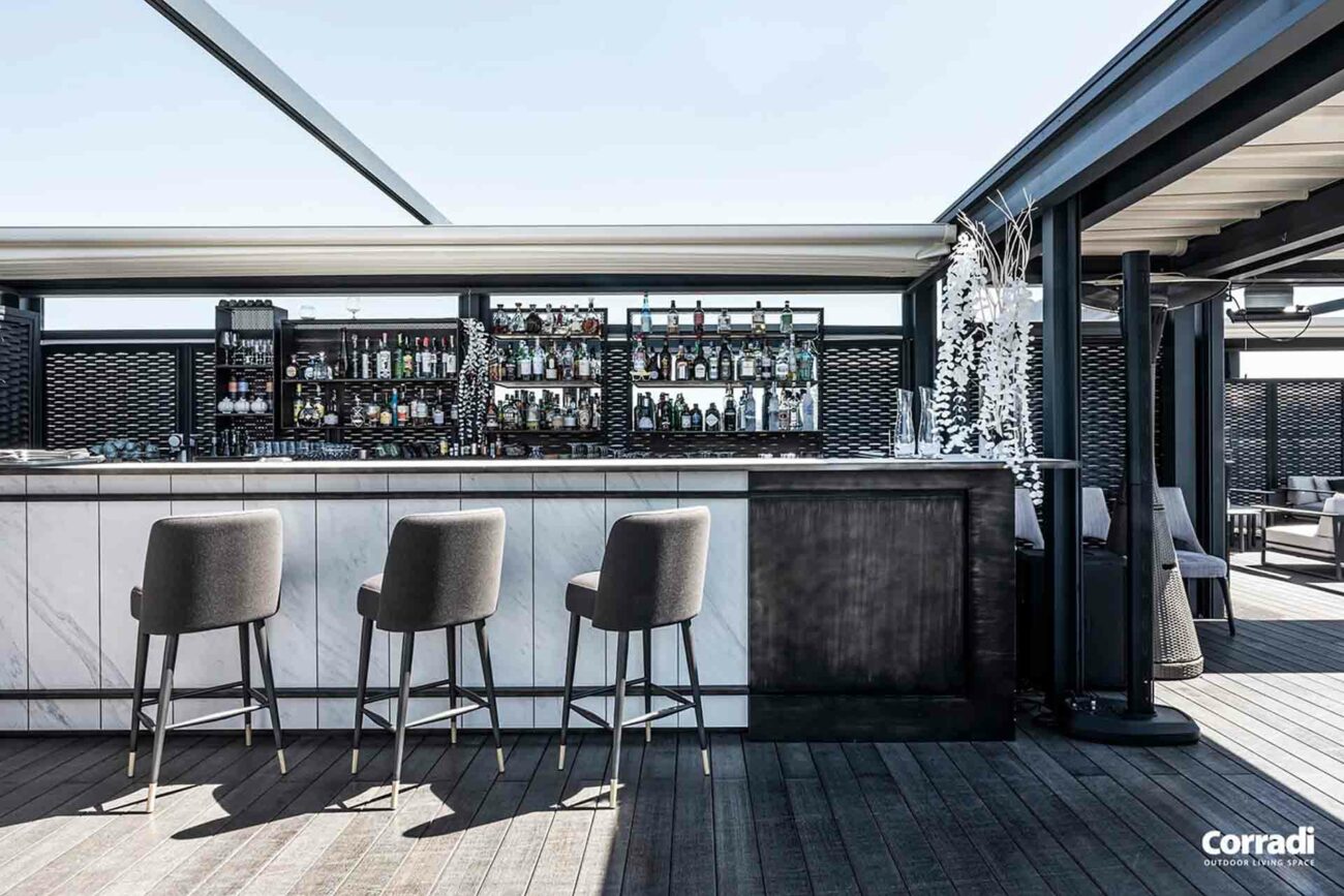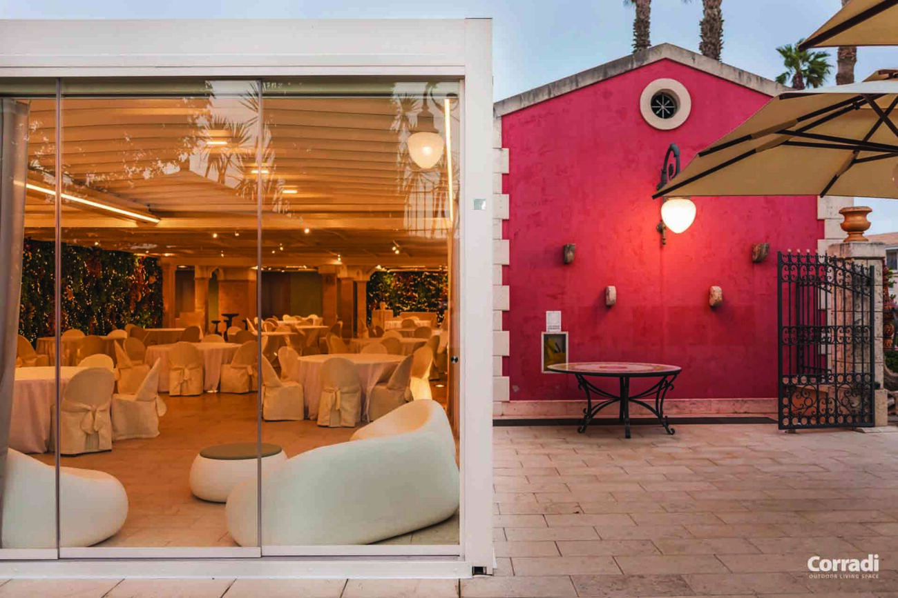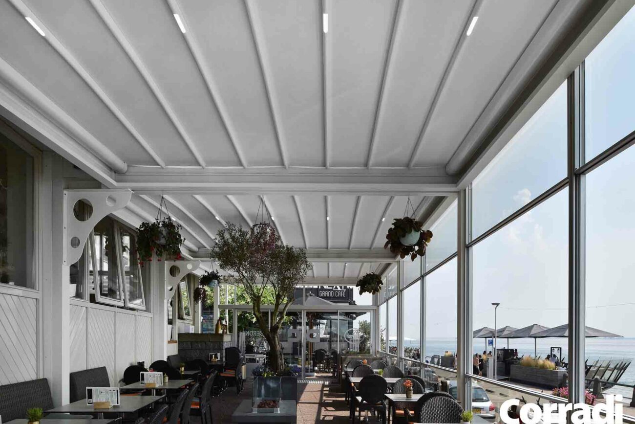 Maestro rappresenta inoltre la soluzione perfetta per il settore contract, rispondendo all’esigenza di un pergolato per il dehor o per il giardino. Entrambe le configurazioni, con telo o lamelle orientabili, permettono di accoppiare le strutture senza raddoppiare il pilastro, coprendo efficacemente e con eleganza anche superfici considerevoli.