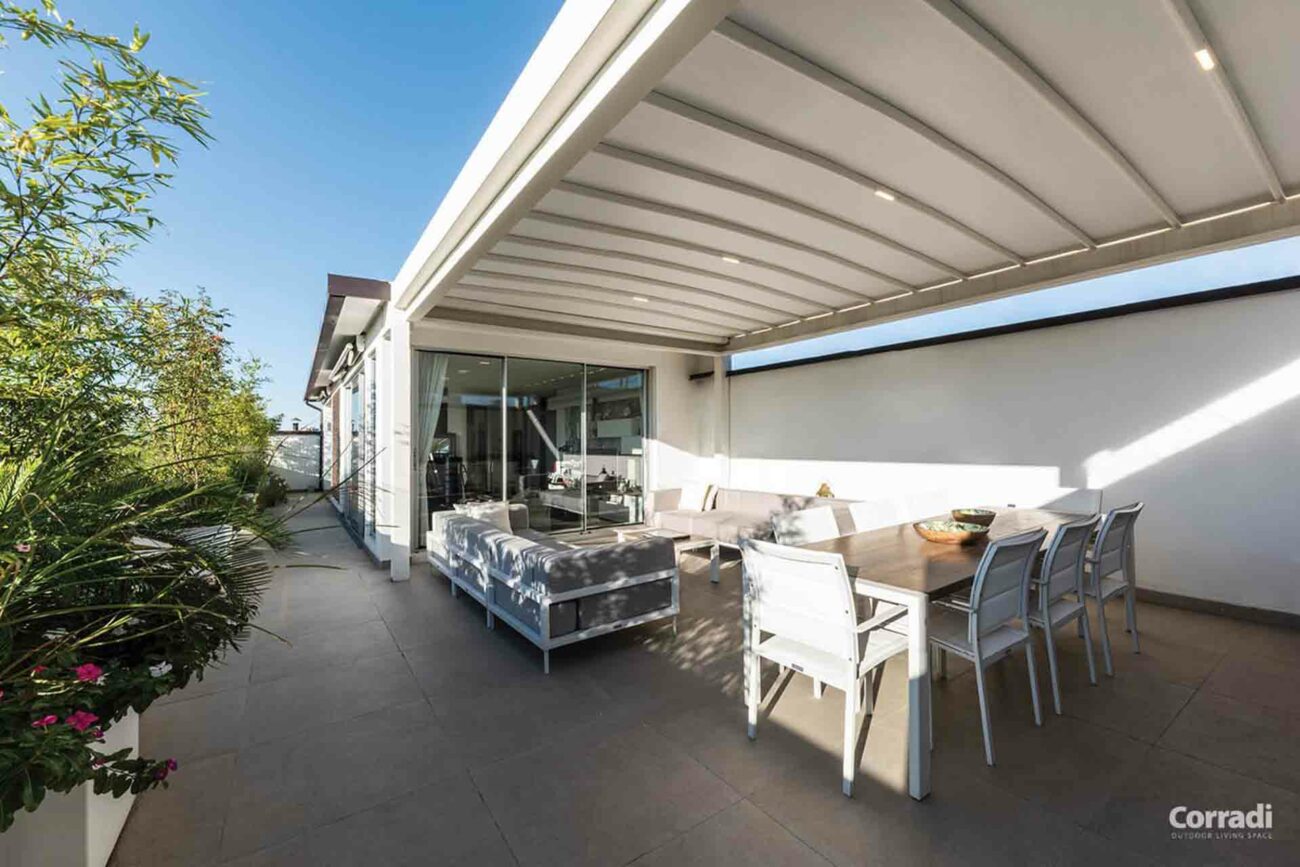 Caratteristiche uniche del prodotto, come il trave frontale alto solo 25 cm, la gronda rientrante alta 12 cm, gli screen integrati e la connessione trave colonna senza carter, conferiscono estrema pulizia alle linee. L’ariosità e le forme allungate di Pergotenda Maestro aumentano il senso di continuità tra interno ed esterno, senza interrompere lo sguardo o ostacolare le esigenze di arredamento.