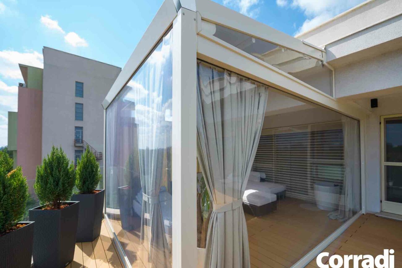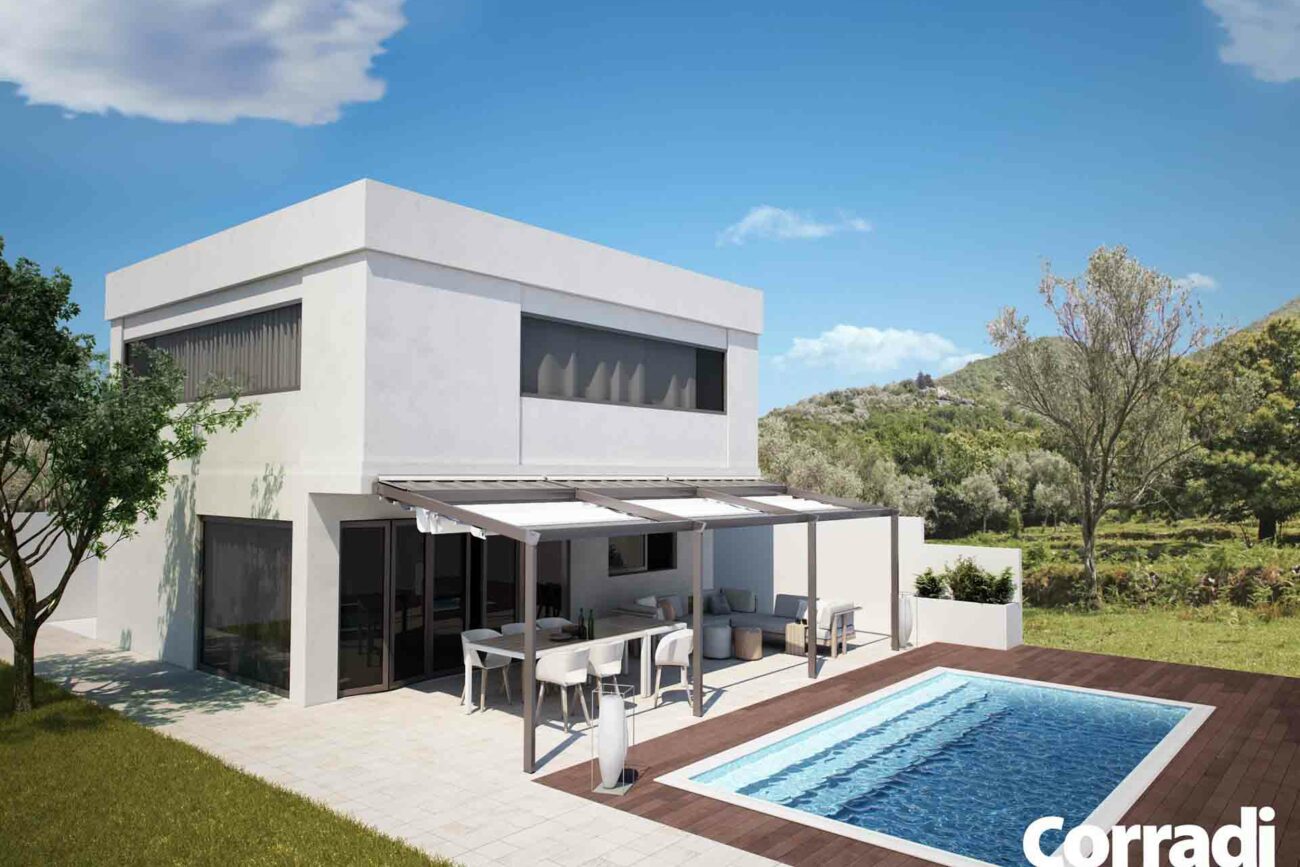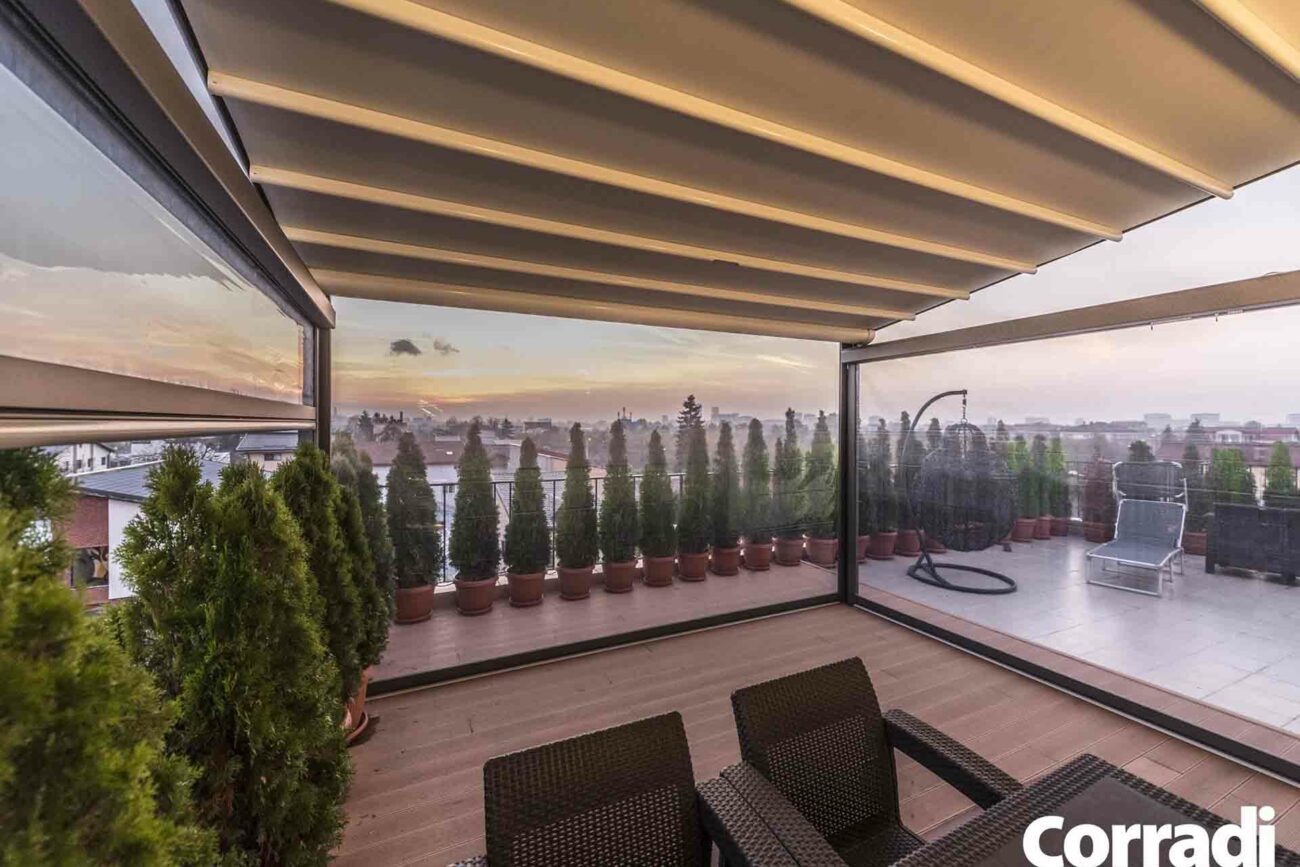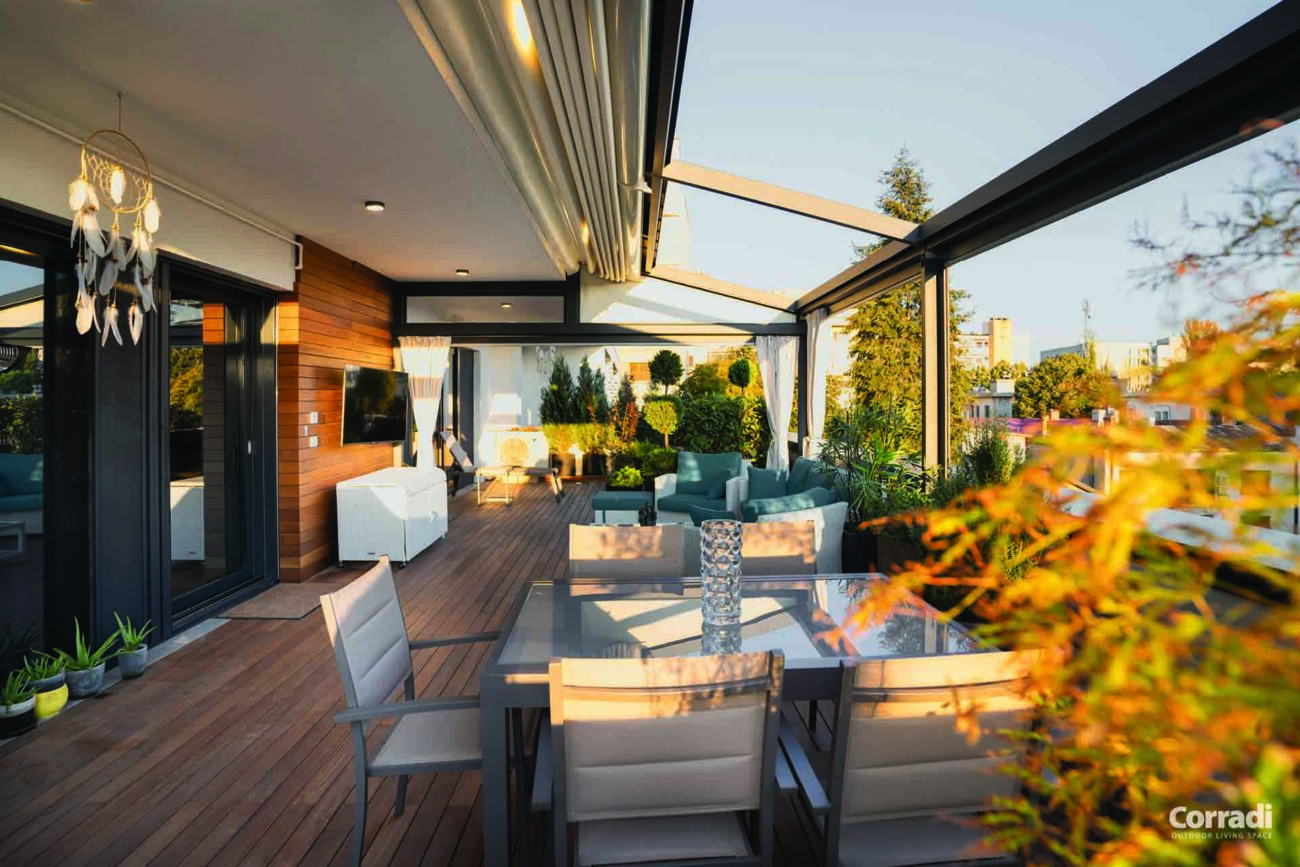 Pergotenda® Palladia® non rinuncia a esprimere un carattere distintivo, grazie alle sue finiture in acciaio inox, un materiale robusto e durevole, e all’accento posto sull’angolo dei nodi anteriori, creando una presenza estetica indimenticabile. Il tutto è completato dalla firma Corradi, simbolo di qualità e artigianalità italiana.