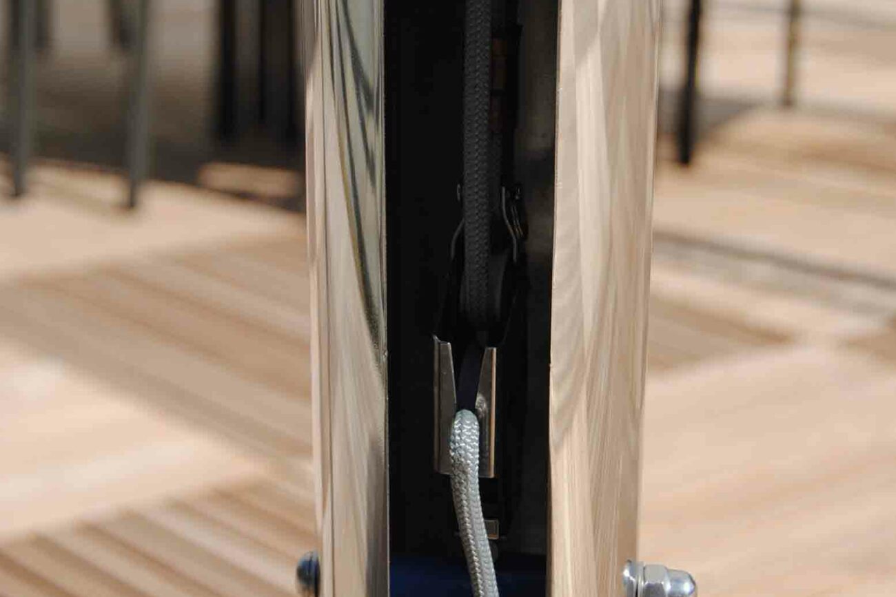 Per quanto riguarda i materiali utilizzati, Corradi si impegna a utilizzare solo i migliori. Acciaio inox e alluminio anodizzato conferiscono robustezza e durabilità alla struttura, mentre il tessuto poliestere e il Dacron®, ampiamente utilizzato nel mondo della nautica per la sua eccellente stabilità dimensionale, rendono la vela resistente ma al contempo leggera. Inoltre, l’uso del Dacron® contribuisce a mantenere la forma della vela nel tempo, anche in condizioni di vento forte.