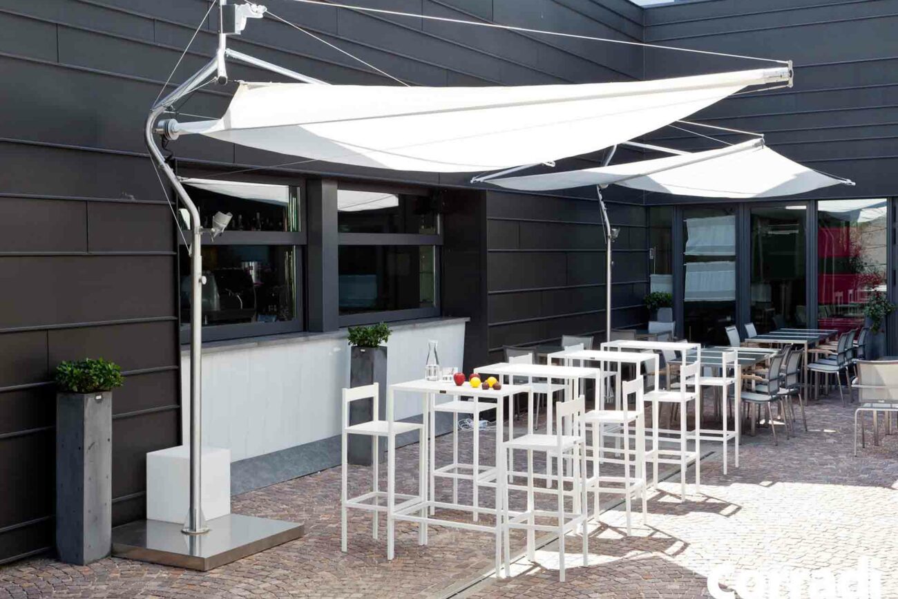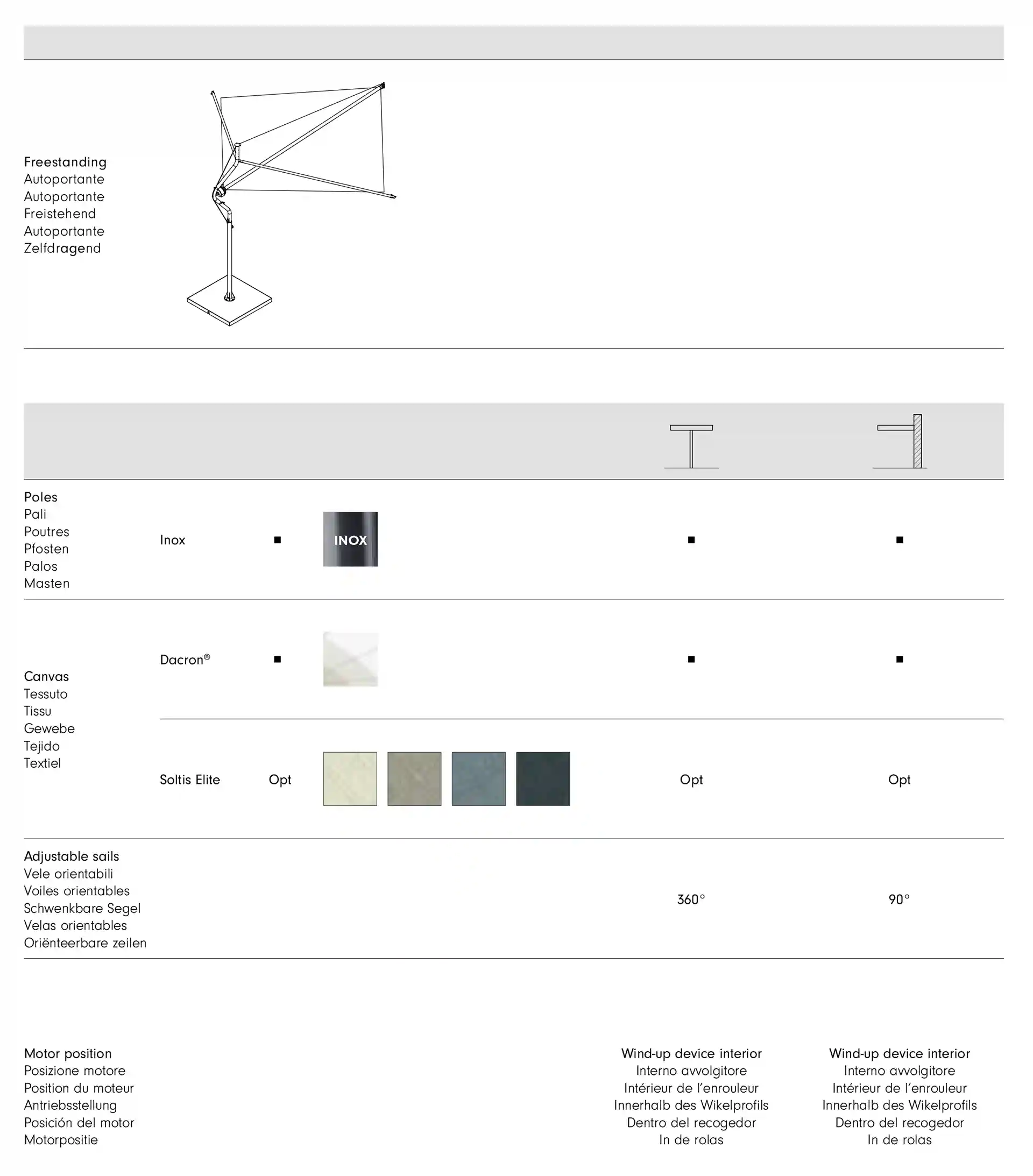 Defense si orienta di 360° nella versione autonoma e di 90° in quella a parete, perfetta per coloro che amano seguire il percorso del sole e godersi l’aria aperta. La vela può essere chiusa in pochi secondi manualmente o tramite telecomando. Nella configurazione con telecomando, la vela è dotata di un anemometro per la chiusura automatica in caso di vento forte.