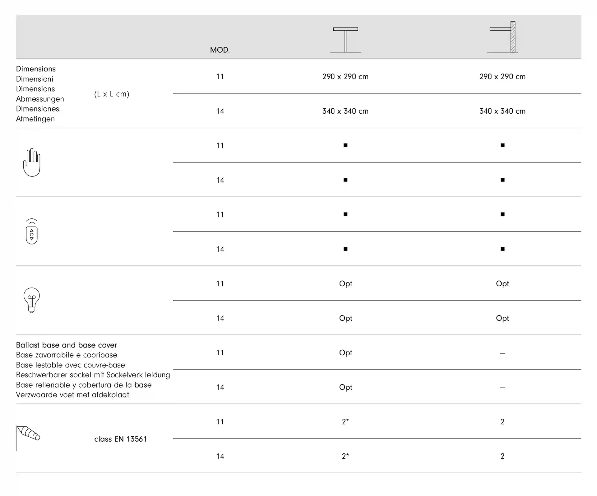 Defense è disponibile in due dimensioni diverse, 290 x 290 cm (Modello 11) e 340 x 340 cm (Modello 14). Come le altre vele ombreggianti, Defense può essere integrata con un sistema di illuminazione a LED: per un’ombra perfetta anche sotto la luna piena.”
