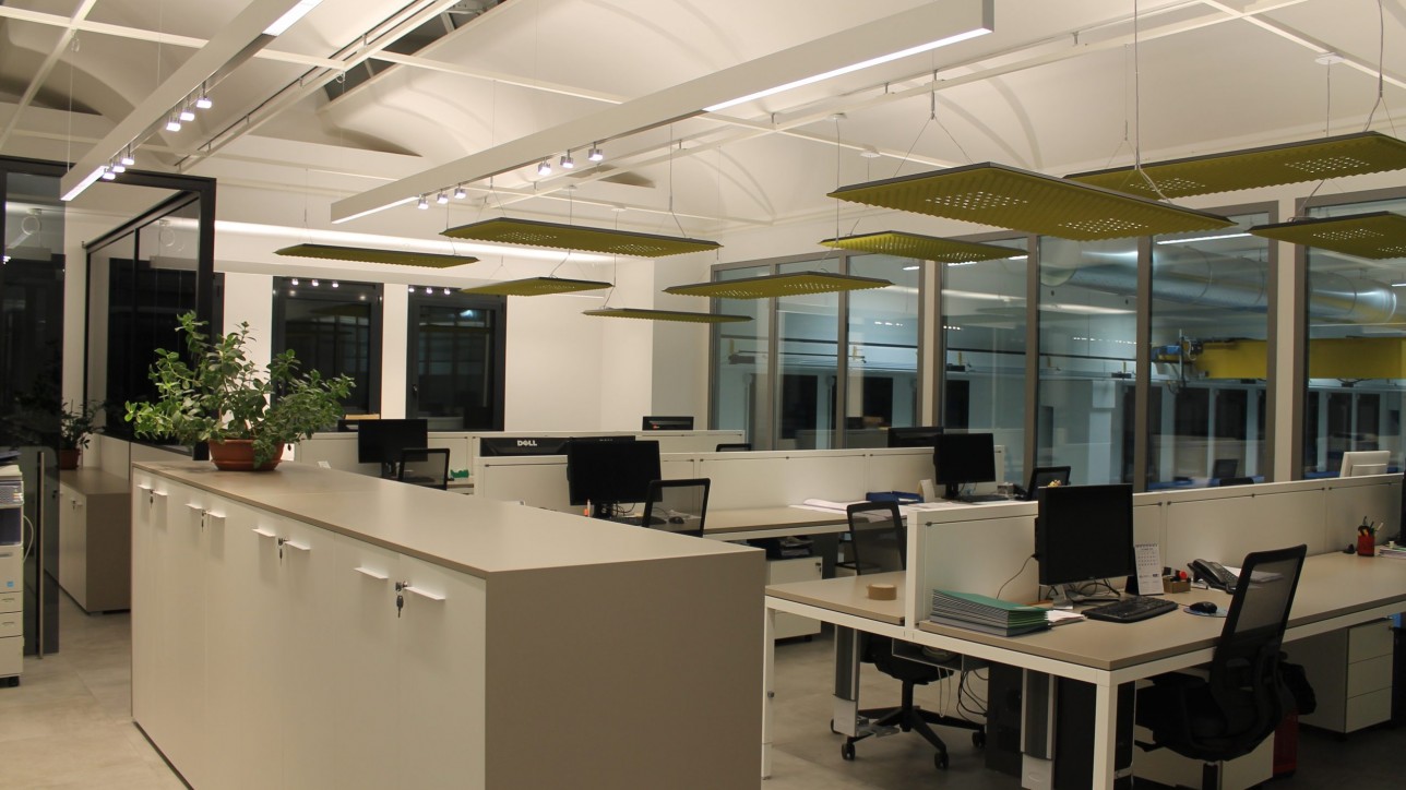 Realizzazione intervento in cartongesso, serramenti, allestimento arredi FREZZA, sedute ICF, impianto illuminotecnico realizzato con pannelli fonoassorbenti ARTEMIDE su struttura autoportante realizzata su misura.